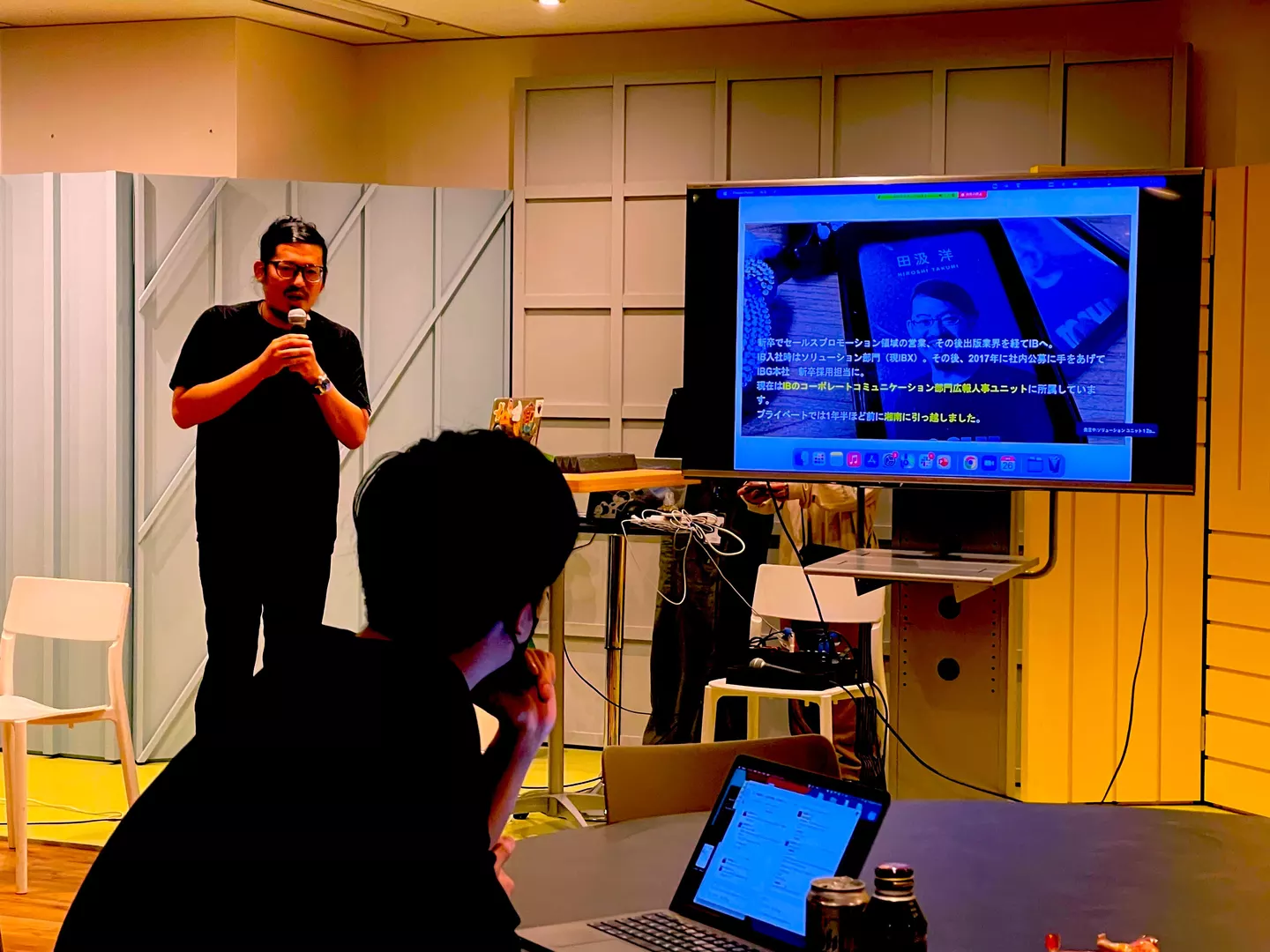 ▲同じチームで働く田汲さんも登壇し、自身がハマっている『新江ノ島水族館』について「シラスを展示しているのに、シラスを食べものとして提供しているのはすごい」と熱くプレゼンしていました