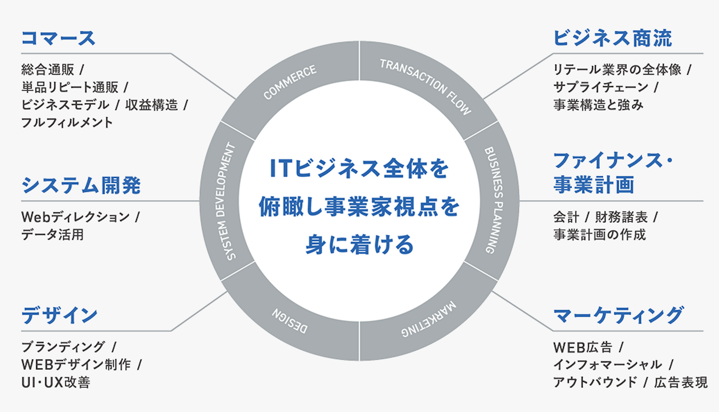 研修内容:ビジネス商流からマーケティングスキル、デザイン、システム開発、コマース、ファイナンスなどビジネスを俯瞰して見られる知識を身に着ける研修プログラムを実施
