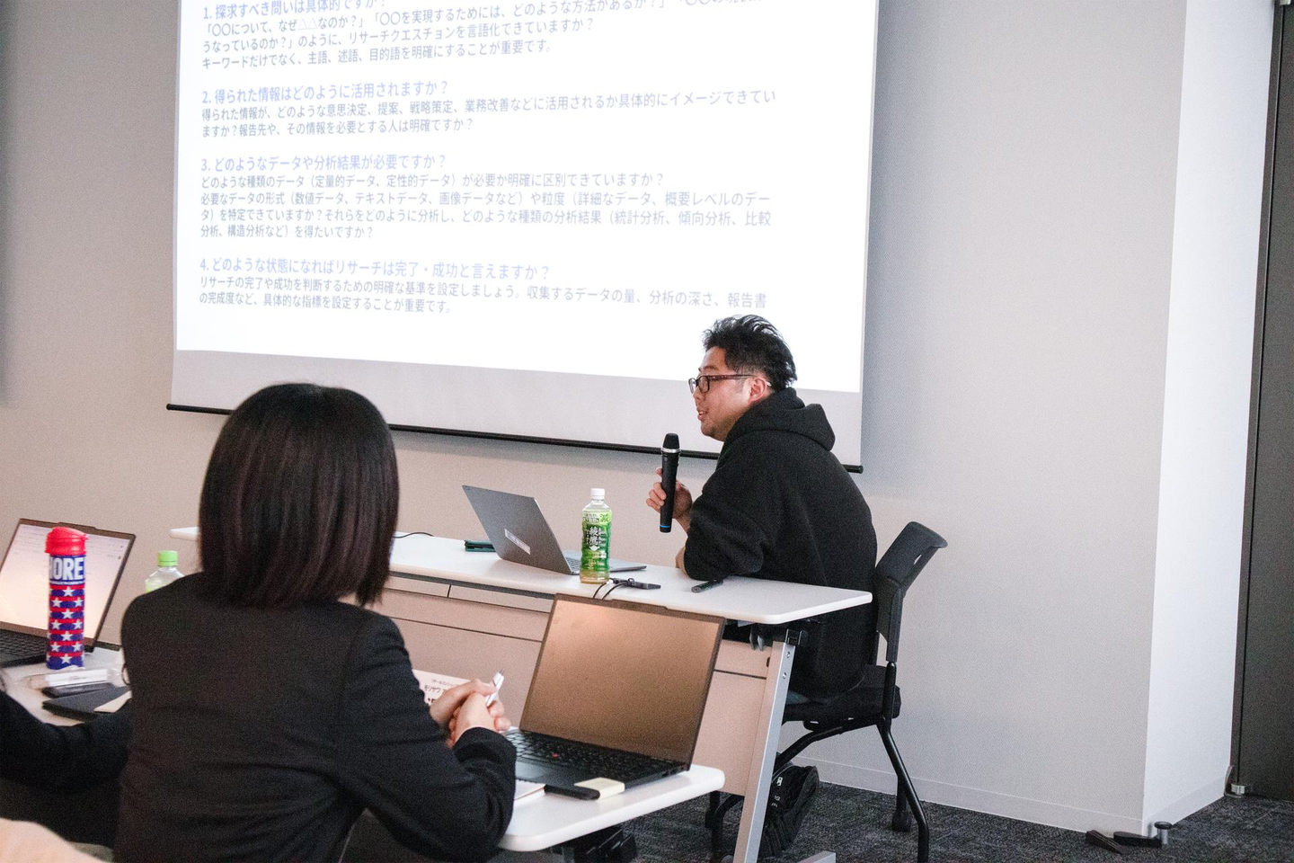 CTOの大森さんによるリサーチ入門研修の様子。「何でも聞いていい」は「何でも聞いていいではない」のはなぜかを入り口に、リサーチ力がビジネス推進力につながる理由を分かりやすく伝えました。