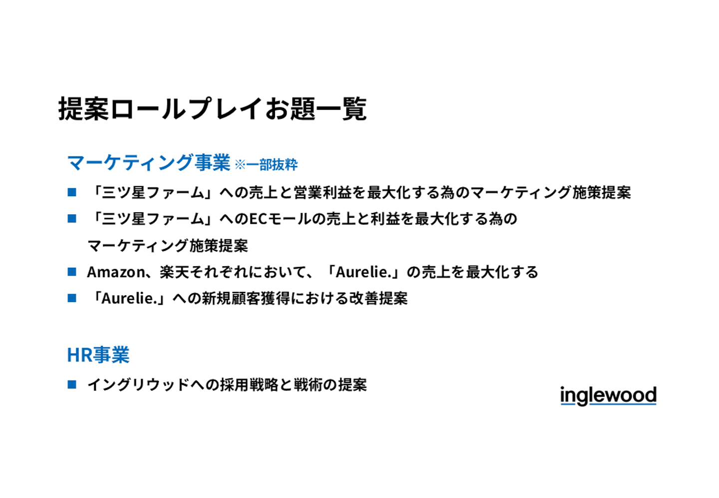 提案ロールプレイングの準備期間は、マーケティング事業(BtoC、BtoB)が3週間、HR事業は2週間です。この期間に、座学で学んだ知識を総動員して、事業提案の企画を練り、資料を作成していきます。