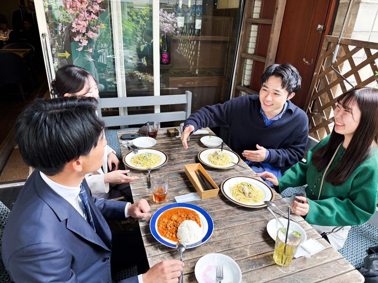 新卒メンターとのランチの様子(左側:25卒社員、右側:24卒の先輩社員)
