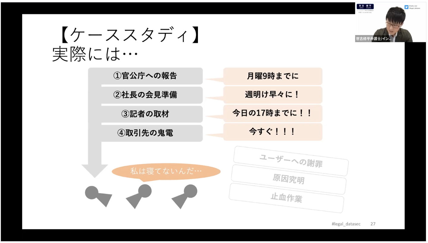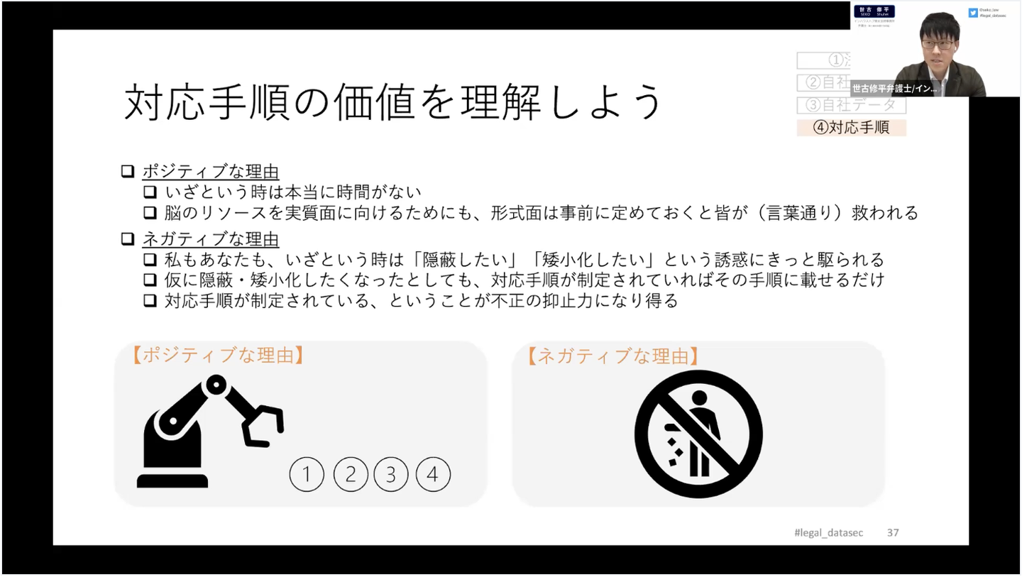 「What」の章では、世古自らの経験から「法務が理解しておくべき4つのこと」を提案。平時と有事に分け、平時の際は①法律、②自社ルール、③自社データ、有事の際は④対応手順を理解しておくことが、法務の立場でなぜ必要なのかを交えながら解説されました。