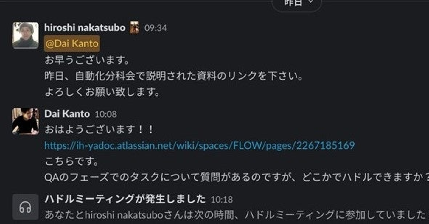 ▲実際のSlack画面。エンジニアグループ所属の関東さんへ、QAグループの中坪さんから資料共有の依頼があり、その後すぐにハドルが始まった様子です。