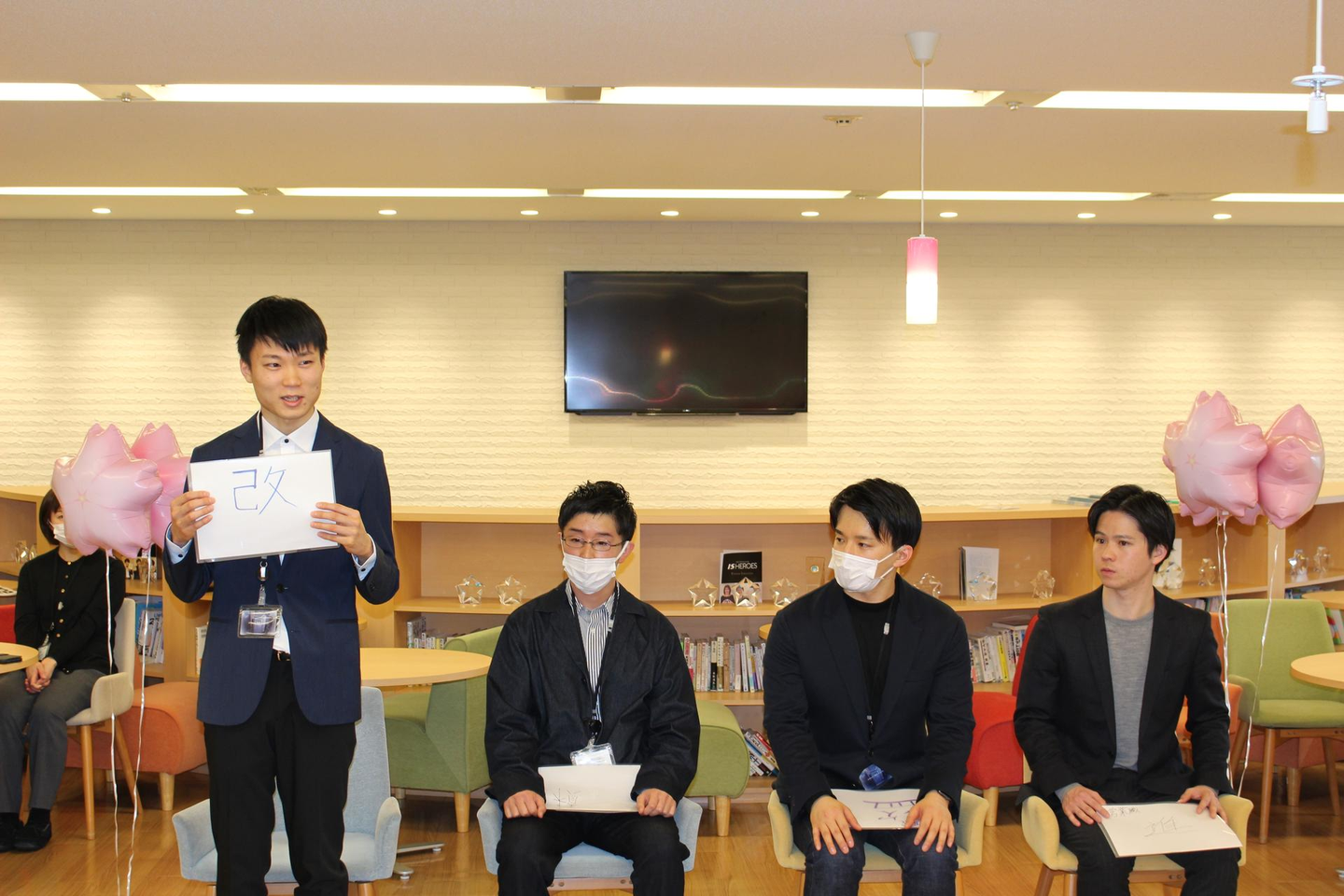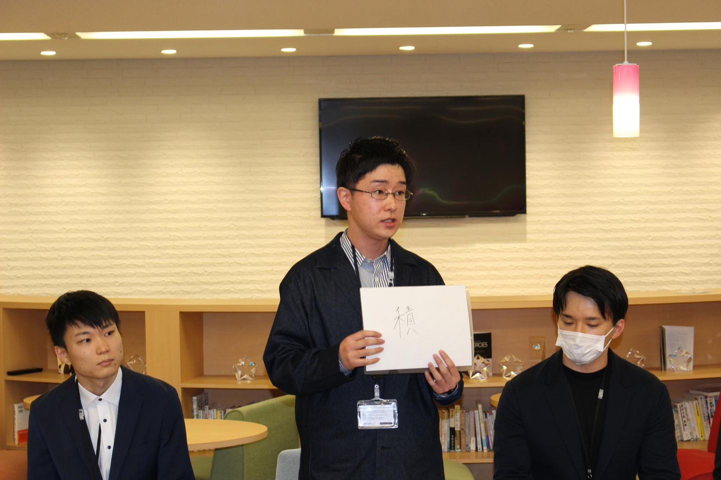 「盗」「進」「積」「改」とそれぞれ選んだ漢字に個性がでていましたが、共通して社会人としての前向きな抱負を発表してくださいました!抱負を聞いて、改めてみなさんの活躍が楽しみです。