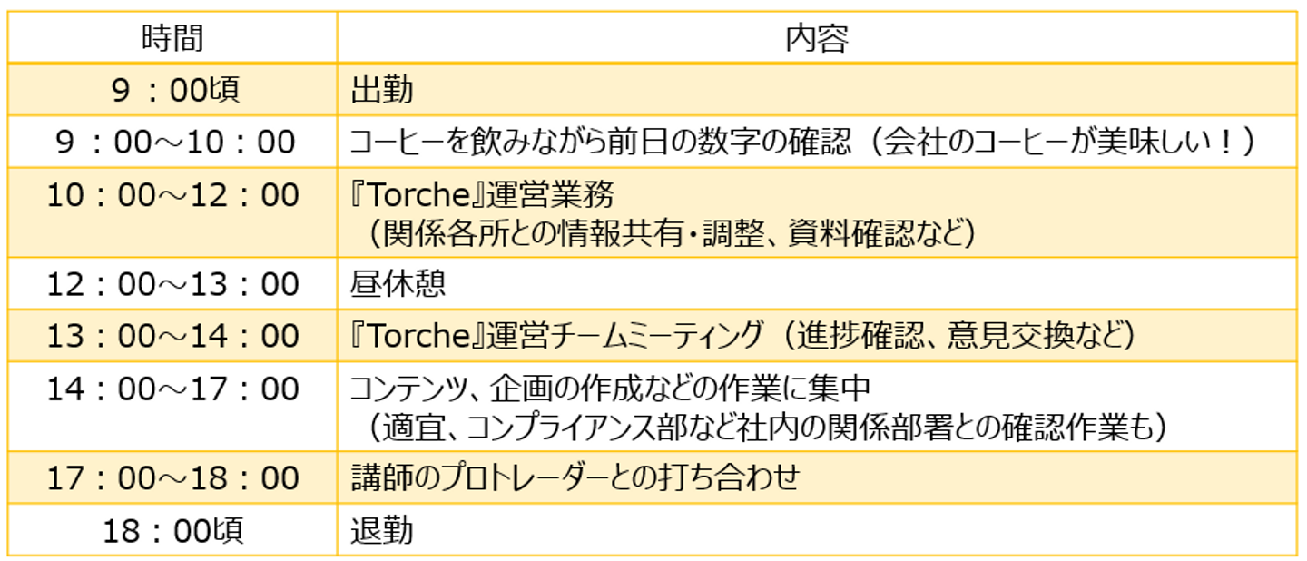 基本は出社で、まずは前日の新規獲得数などの各種数字を確認し、当日の作戦を考えるところから始まります。途中で打ち合わせが入ることもありますが、業務の中心は『Torche』の企画を考えたり、進行中のプロジェクトを調整したり、講師であるプロトレーダーさんとのやり取りや資料の確認を行ったりすることです。