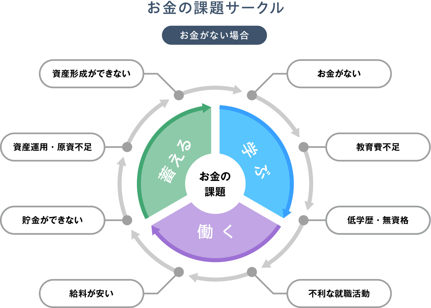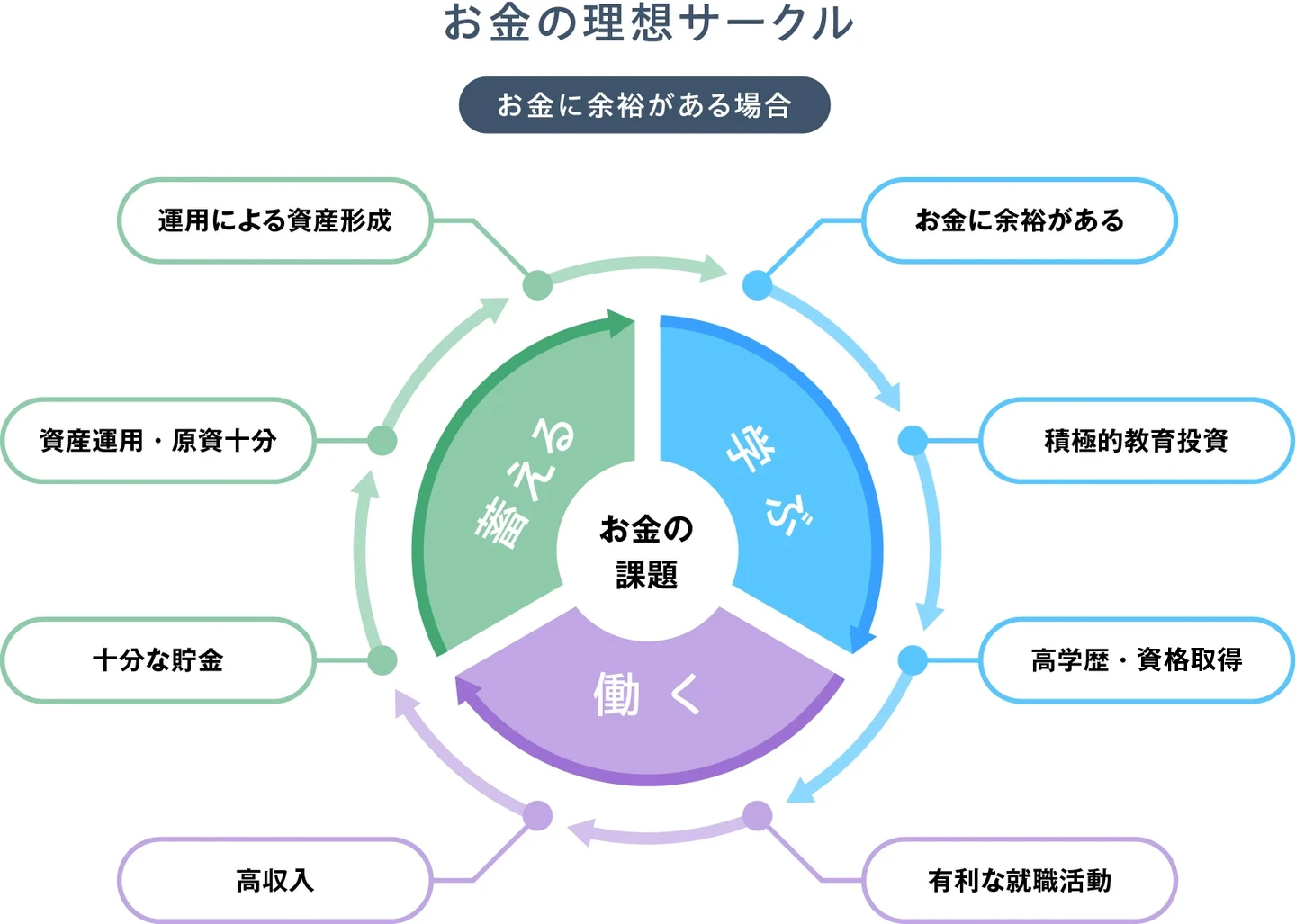 「お金の課題」をより具体的に考えると、人生を構成する「学ぶ」「働く」「蓄える」という各フェーズに分けることが出来ると思います。そして、「学ぶ」為の教育資金の有無が、収入の額を左右する就職、すなわち「働く」というフェーズに大きな影響力を持っていることがわかります。更には、収入の額が多いか少ないかは、貯金や貯蓄、投資に回せるお金の額に大きな影響力を持ち、その結果、資産を「蓄え」形成するという、「お金の課題」を解決する原資そのものの多寡を決めてしまう構図が見えてきます。