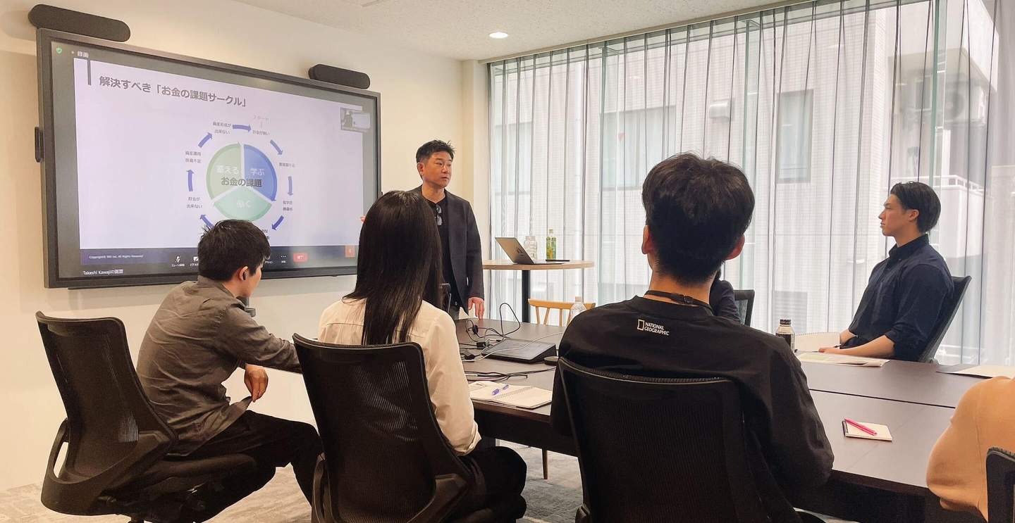 まずは、インヴァストの川上専務による「金融業界スタートアップ講座」からスタート。この講座では、金融の基本構造と金融業界全体を体系的に解説。「金融=お金を融通する仕組み」であるという原点から、家計・企業・政府の三大経済主体、銀行・証券・保険の違い、FinTechの流れまで、図解を交えてわかりやすく講義されました。