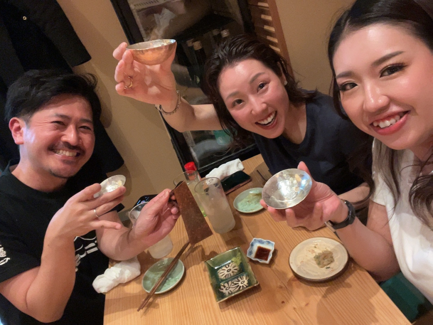 その夜、櫻井さんの紹介で「おでん こうぞう」に行った。ここでの一杯が格別だった。 大きな”銅鍋”がドーンドーンと2つ。店中がお出汁の良いにおいで満たされている。「タゼンさんで盃をつくってきたんです。これで乾杯してもいいですか?」と聞くと、スタッフみんな寄ってきて、出来立てホヤホヤの盃を覗き込みながら「良いなあ、上手だなあ。良いなあ、作りたいなあ。」と興味津々。