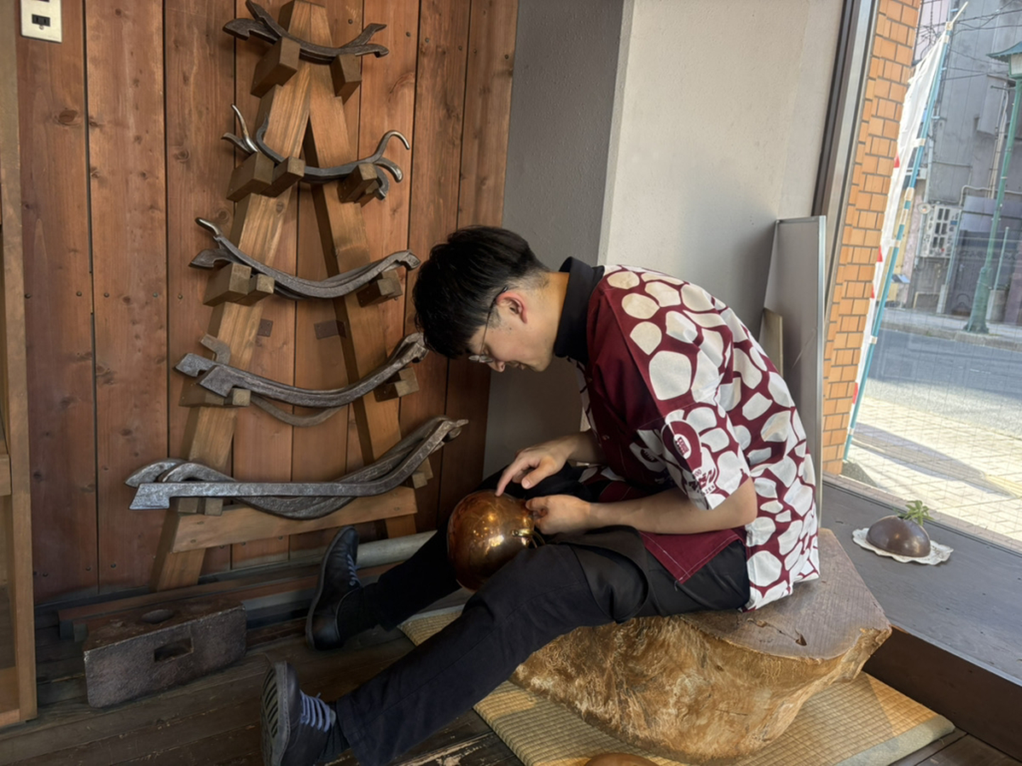 きっかけを作ってくれたオヤマン、新メンバーのミノリンと3人で仙台は青葉区へ向かう。最初のお目当ては(株)タゼンで開いている盃作りのワークショップ。担当してくれたのは新卒入社の御銅師、櫻井さん。まあるいクラシカルなメガネに銅の文様をあしらった臙脂色の法被がベストマッチ。櫻井さんの話は、すごく面白かった。