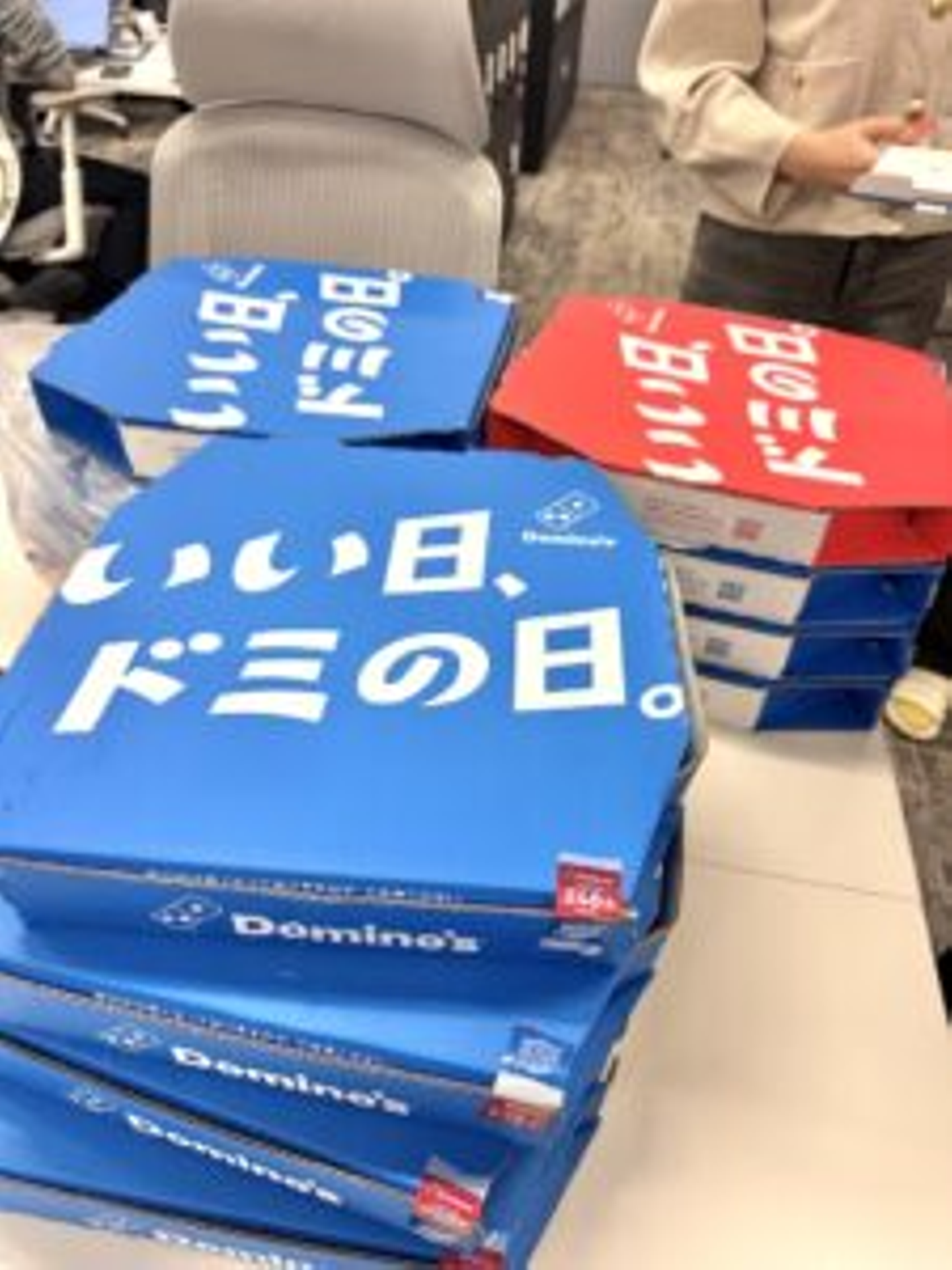 入社初日には、新卒メンバーがすぐにチームに溶け込めるよう、歓迎ランチ会を開催しました!オフィスにピザを用意し、リラックスした雰囲気の中で、先輩社員との交流を深めました。