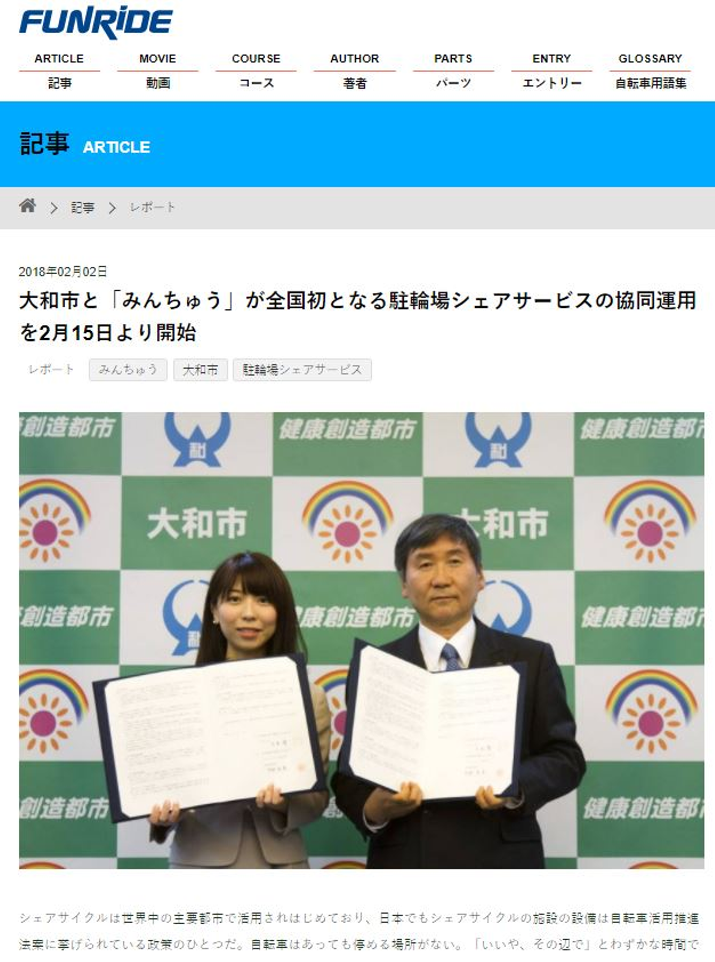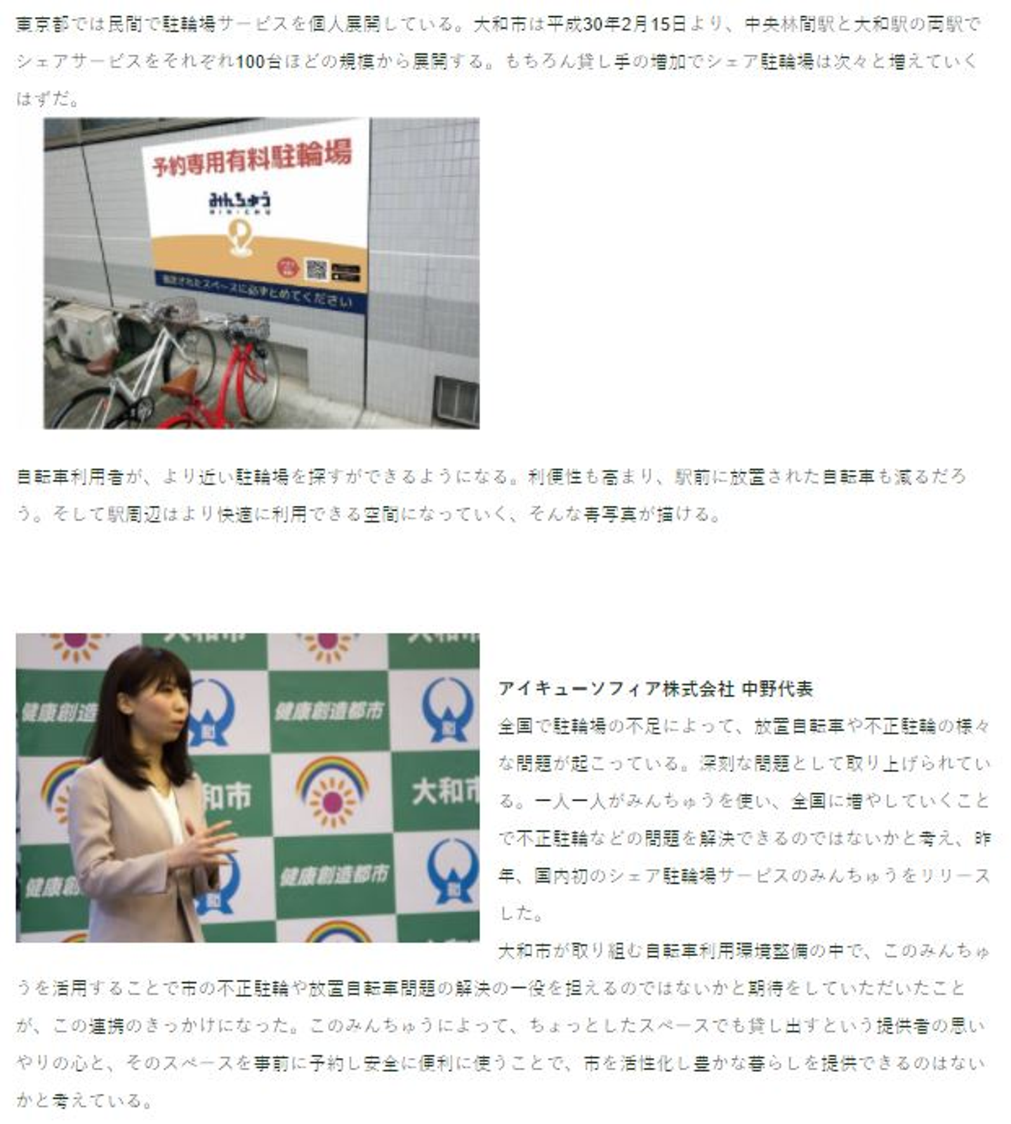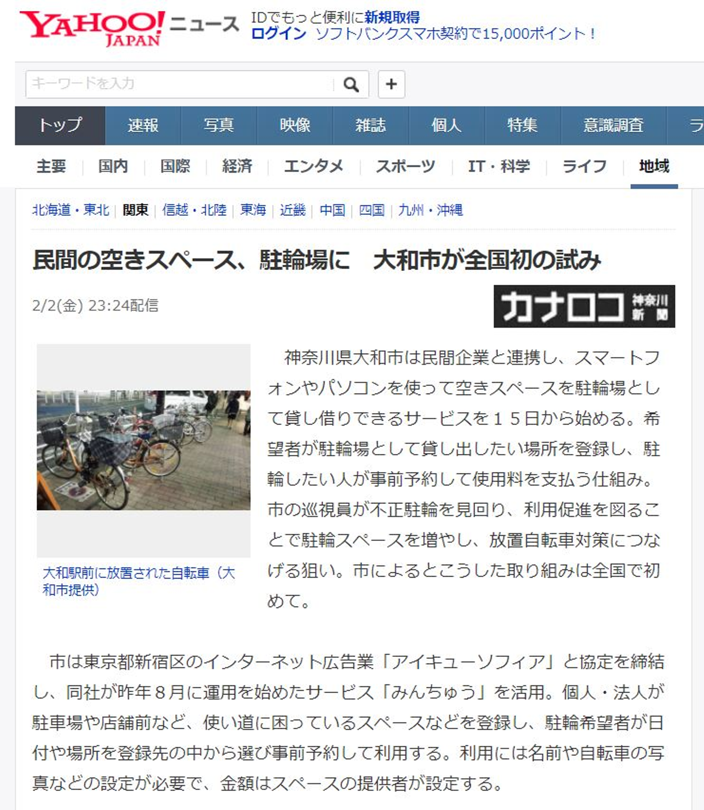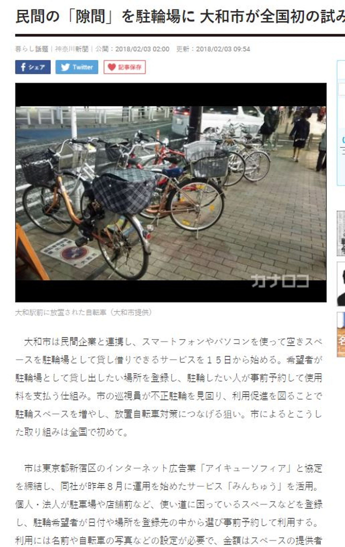大和市は民間企業と連携し、スマートフォンやパソコンを使って空きスペースを駐輪場として貸し借りできるサービスを15日から始める。希望者が駐輪場として貸し出したい場所を登録し、駐輪したい人が事前予約して使用料を支払う仕組み。市の巡視員が不正駐輪を見回り、利用促進を図ることで駐輪スペースを増やし、放置自転車対策につなげる狙い。市によるとこうした取り組みは全国で初めて。 ...