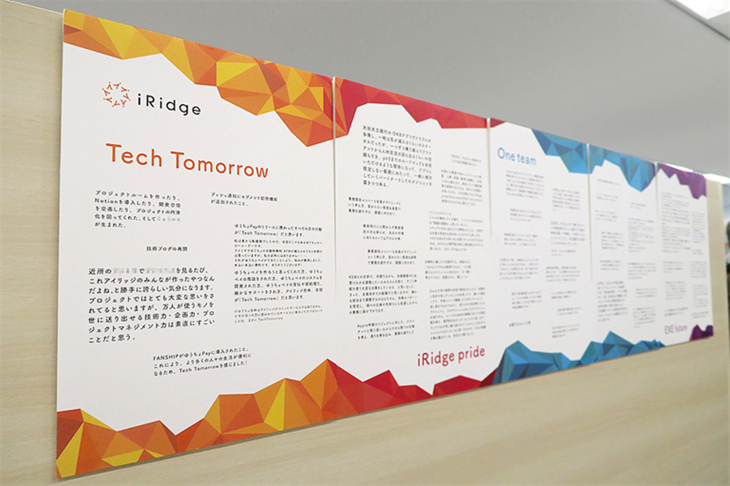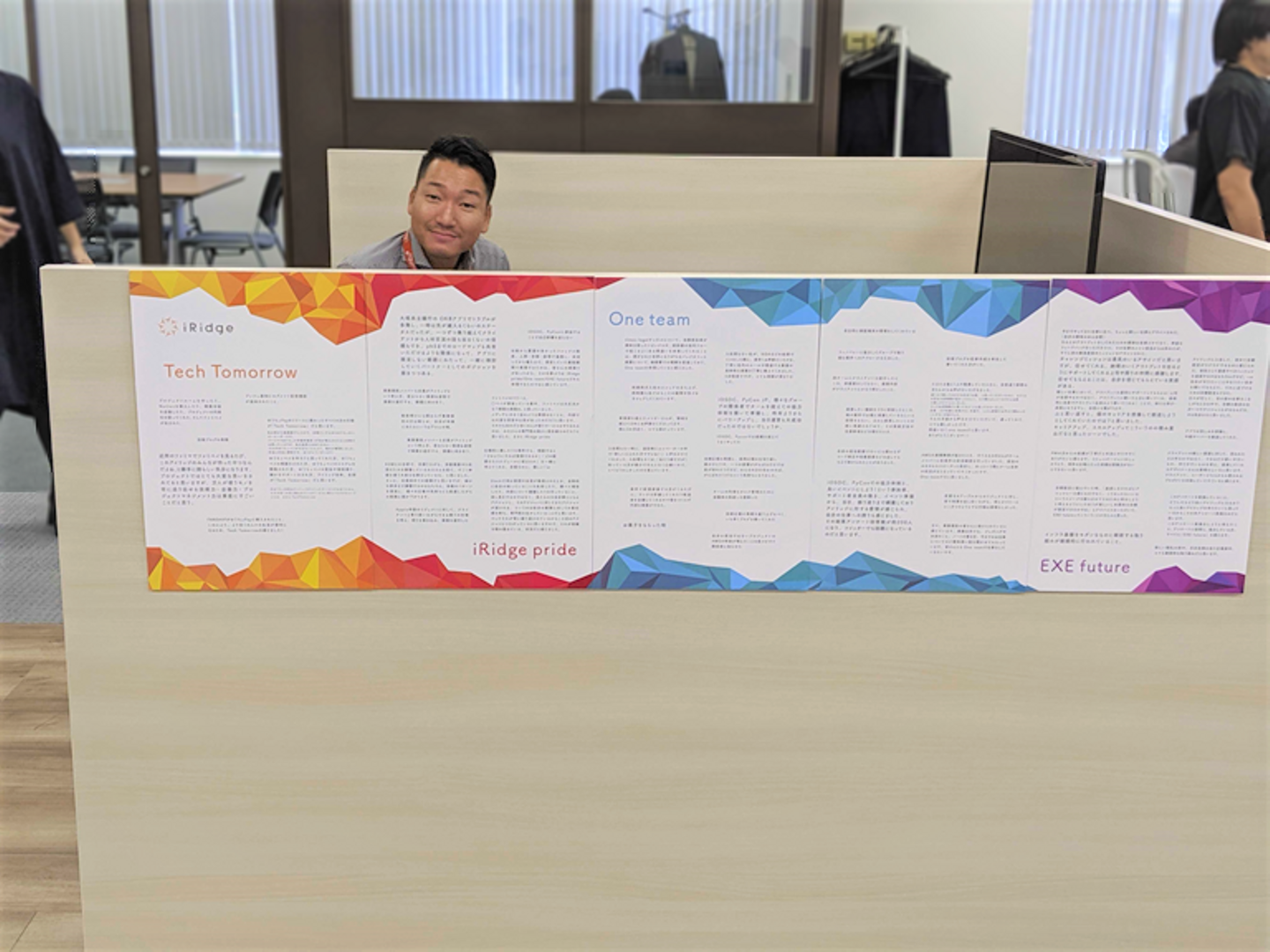 バリュー「iRidge pride(責任感と専門性で信頼を積み重ねよう)」には熱い情熱を感じる赤色を、「One team(組織を超えて一丸となろう)」には調和や一体感を感じさせる翠色を、「EXE future(想像して創造しよう)」には独創的なイメージの紫色を当てました。