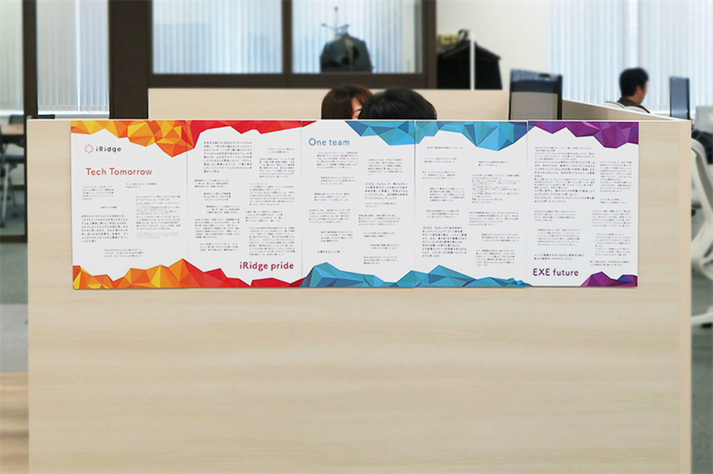 ノベルティや資料などで使われている、海嶺(iRidgeのRidge)をイメージしたポリゴンデザインがあるのですが、これをミッション・バリューごとに色を分けてアレンジしたデザインになっています。