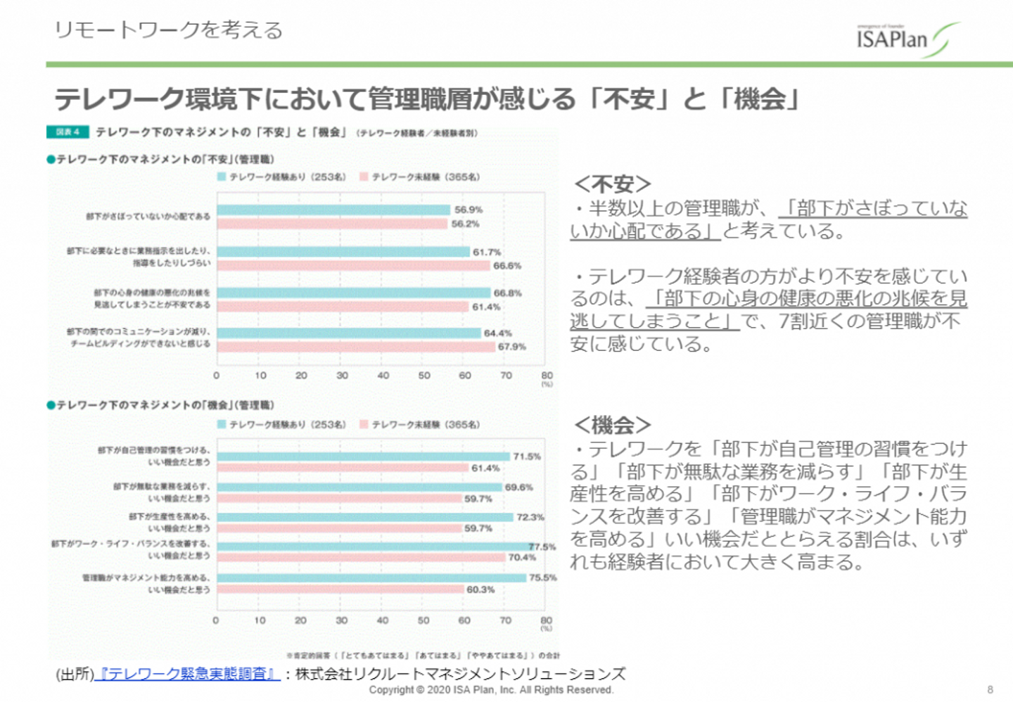 以前定例会ではみんなでリモートワークの特性について考えるというエクササイズを実施しました。「通勤がなくて楽ちん」以外の要素がたくさんあること、特にリーダー層が感じる苦労がたくさんあることを学べたと思います。