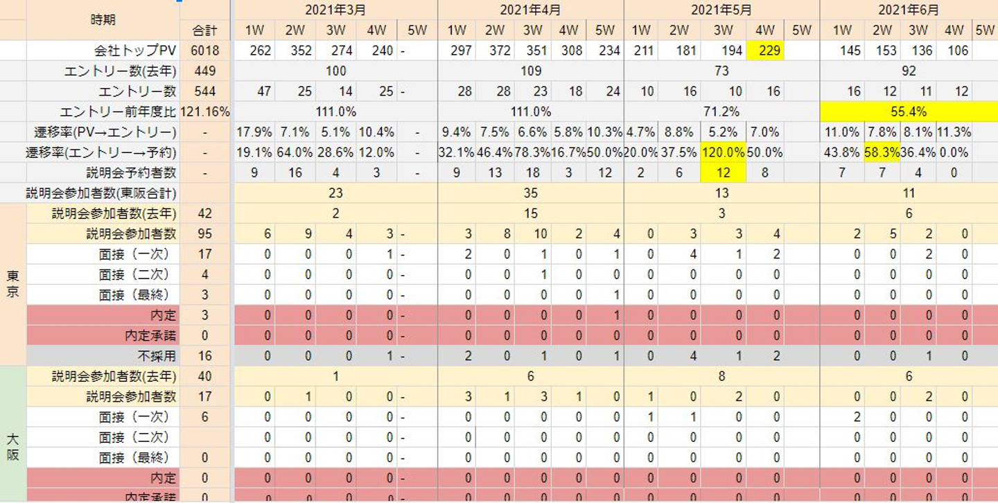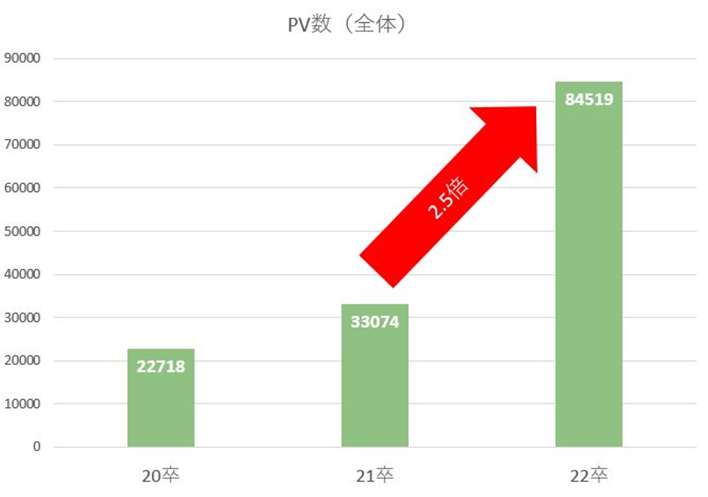 本格的にマーケティングの考え方を意識してから、年々PV数が上がっていることが分かります。なお、採用活動の間は週次にてPV数やエントリー数、説明会参加人数などの数値の振り返りも行っています。数字が伸び悩んでいる場合には広告の文言を変えてみたりと、少しずつ改修をしていたことも良い影響を与えたと考えられます。