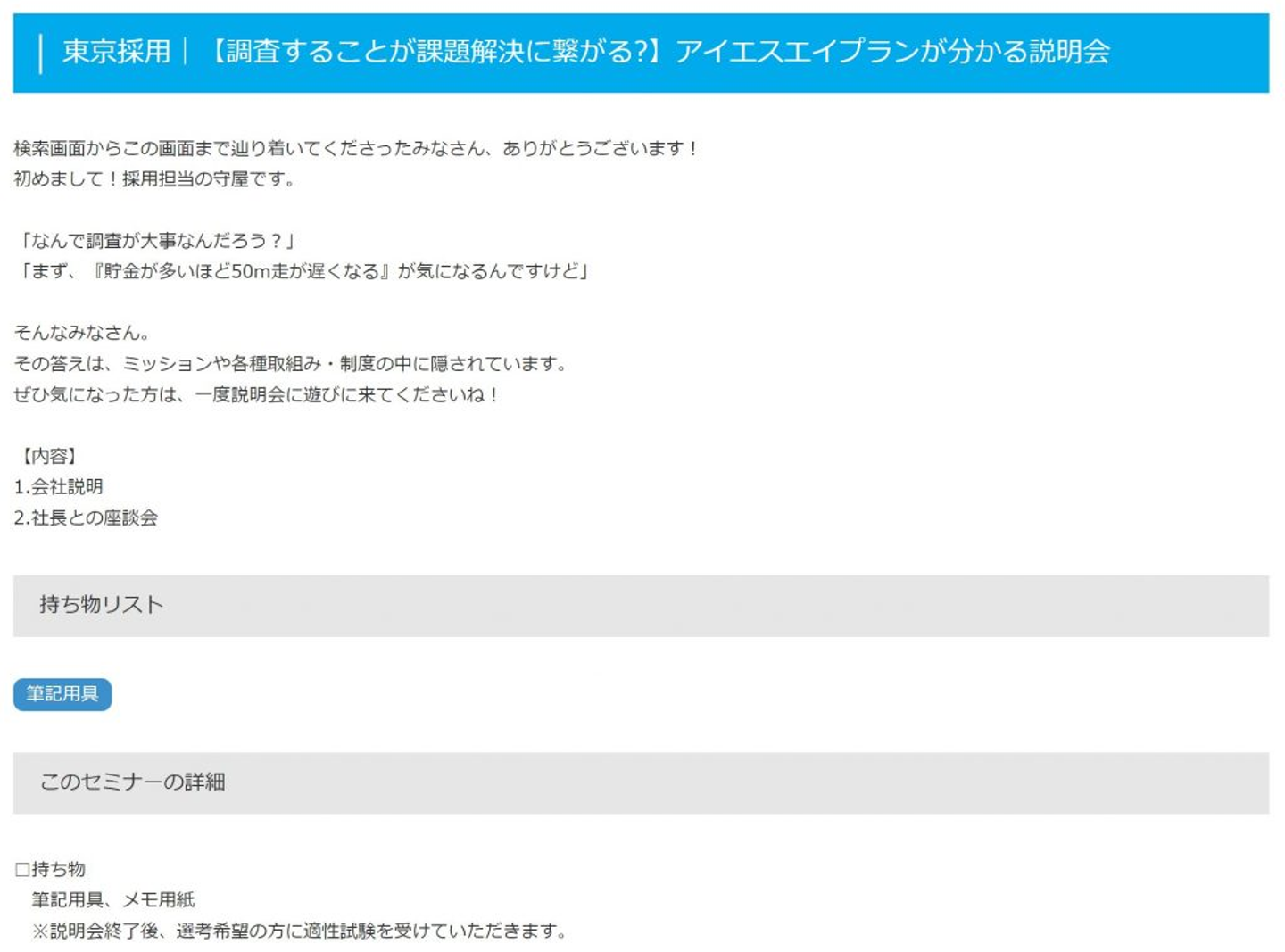 ⇒まずは、アイエスエイプランの会社ページをクリックしてもらえなければ、その後の説明会への誘導もできません。まずは学生が「気になる」「興味を持つ」ための工夫が必要です。