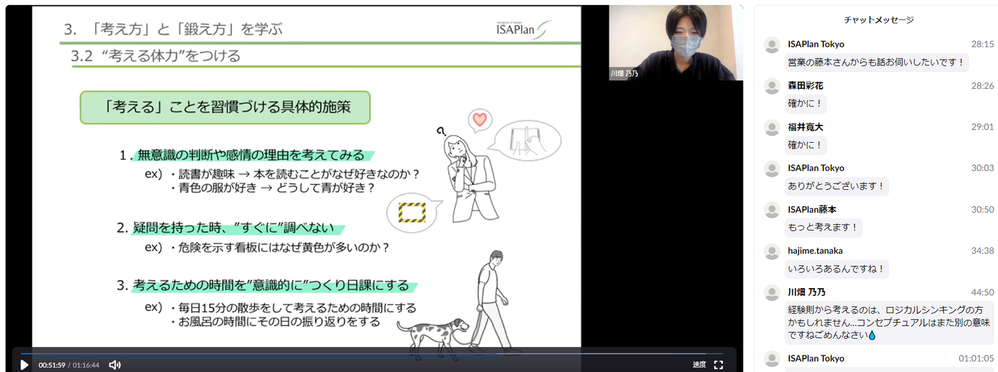 (画像)Zoomで開催されたセミナーの様子。今回は「考える力」をテーマに新入社員の講師が研修を進行しています。
