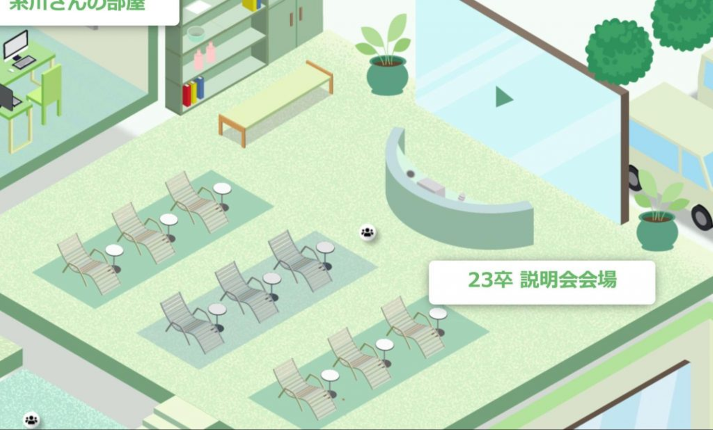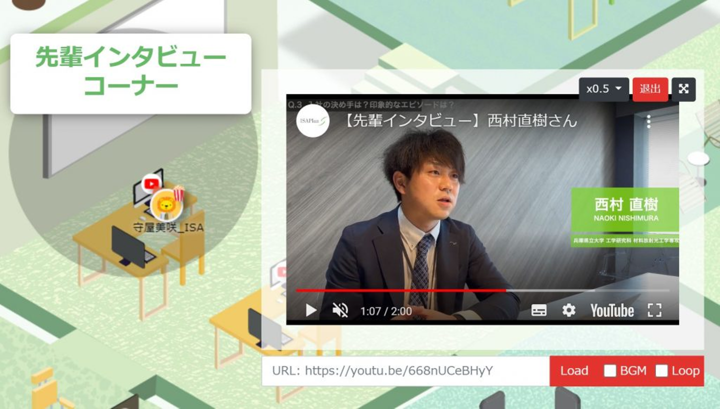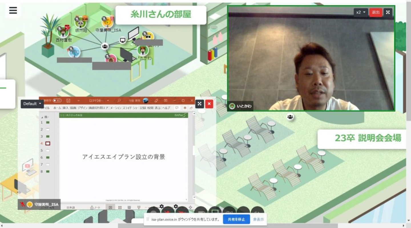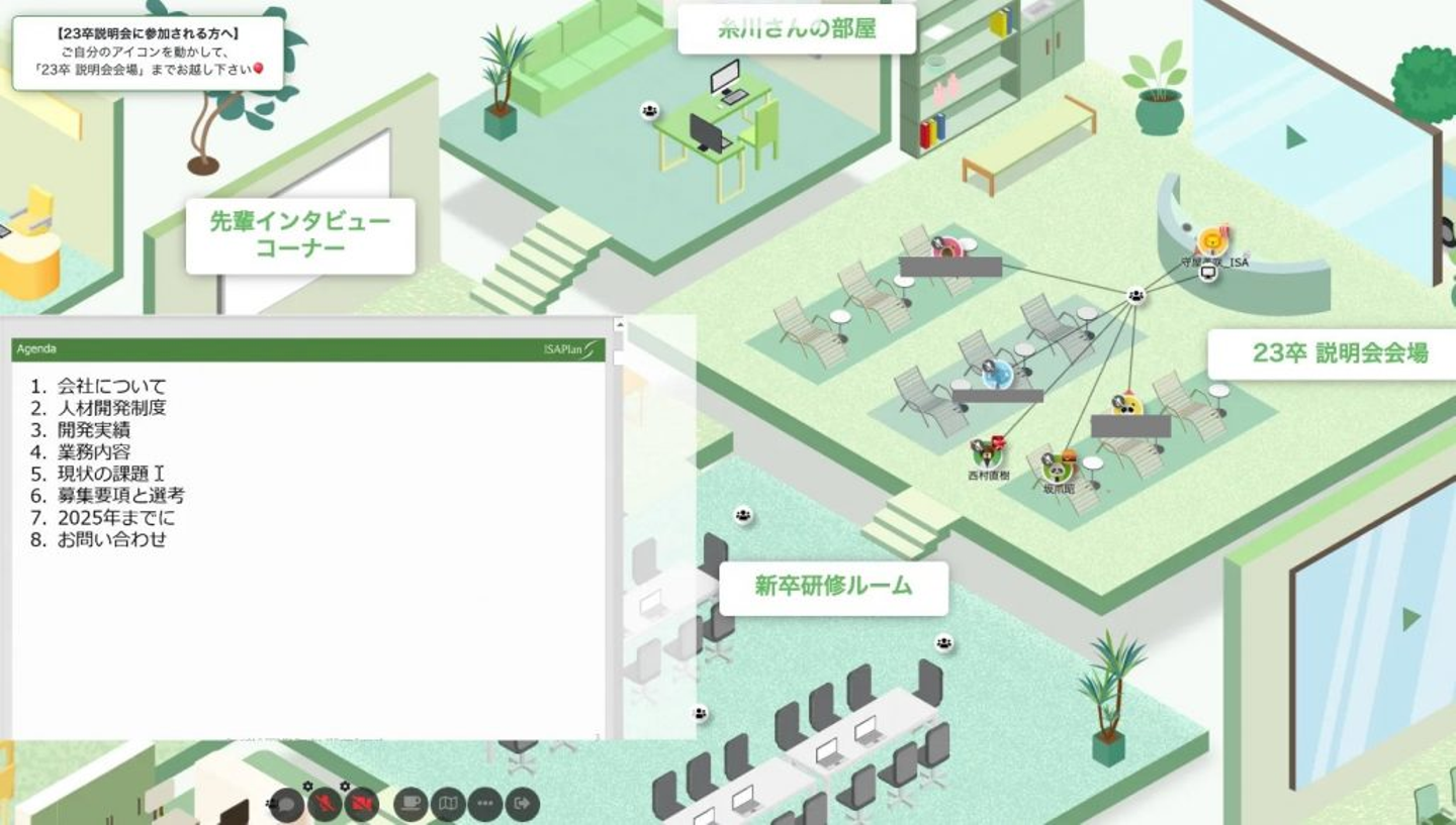 普段のオンライン説明会では、時間になったら糸川さんに入室していただくシンプルな形で進めていますが、せっかく動きのあるメタバースを使うのであれば、糸川さんの部屋にお邪魔するのも面白いなと考えました。そこで、予め用意していた糸川さんの部屋へぞろぞろと移動し、アイエスエイプラン設立の話や未来の話を聞きました。