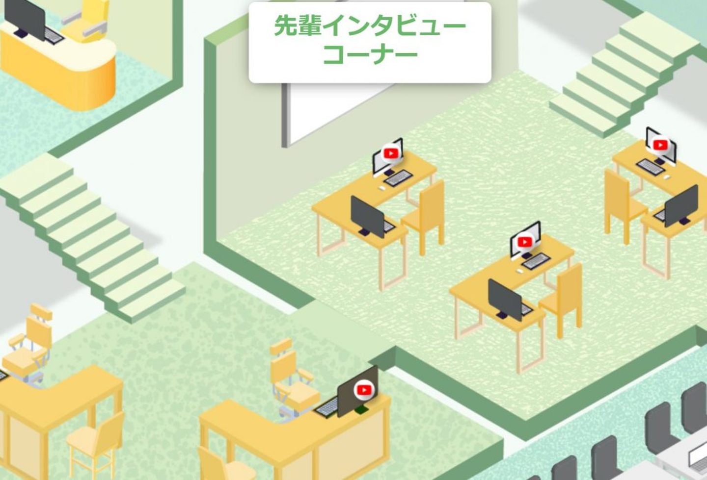 各机に先輩社員6人のインタビューが設置されており、近くに寄ってみると動画が流れるようになっています。