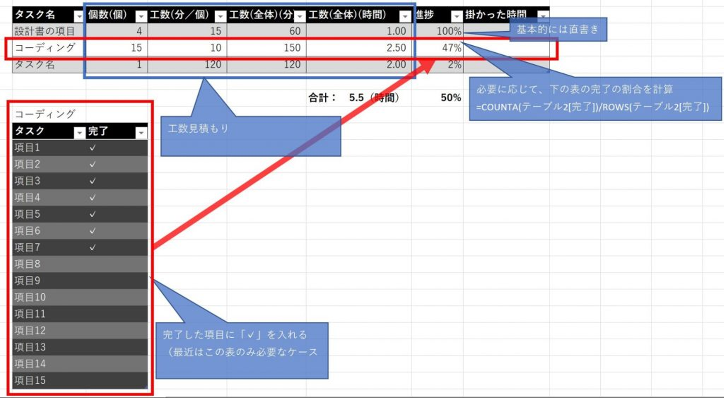 進捗管理をExcelで行うようになったのは、プロジェクトリーダーに進捗状況を伝える際、なかなか上手く伝えられなかったことがきっかけとのこと。そんな時に、Excelで進捗状況を見える化したら良いのでは?と考え、活用し始めたそうです。