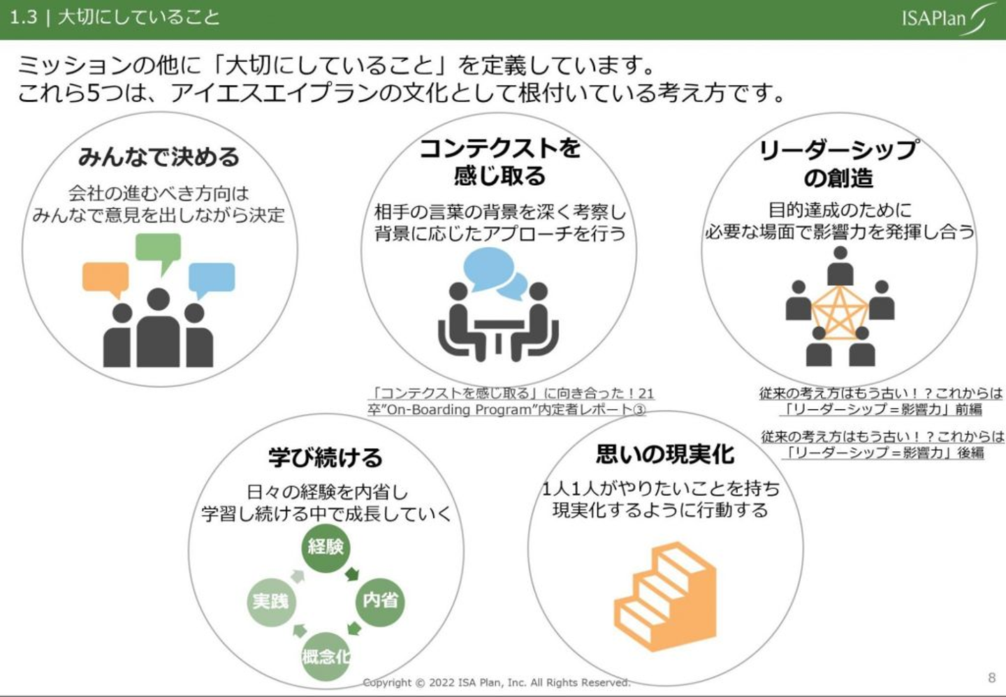 アイエスエイプランでは、「大切にしていること」の一つに「学び続ける」を挙げています。何かの経験をした後には、必ず内省(振り返り)を行うことで改善を考え、また実践をする…。この繰り返しを経て、成長し続けることが大切だと考えています。