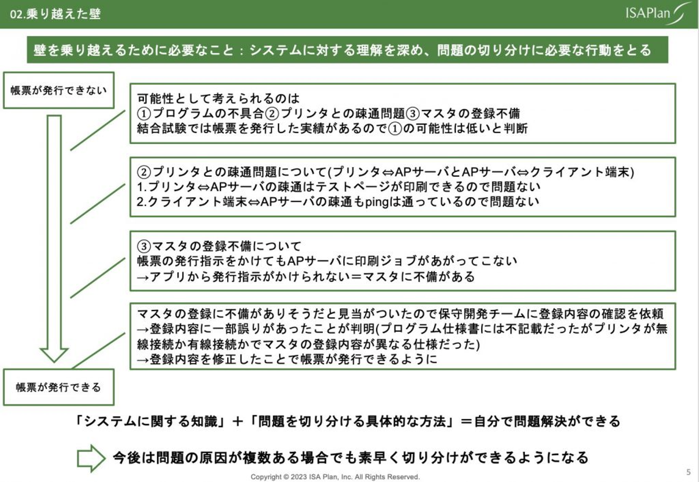つまり、私が乗り越えた壁は、問題が発生した際に、原因を切り分けることができず人に伝えるだけになっていたということです。