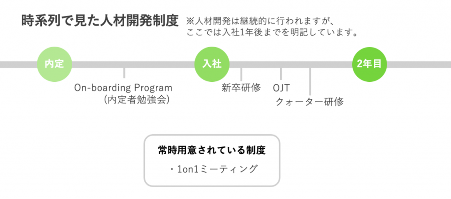 例えば、内定時から入社して一年目では以下のような人材開発制度が用意されています。