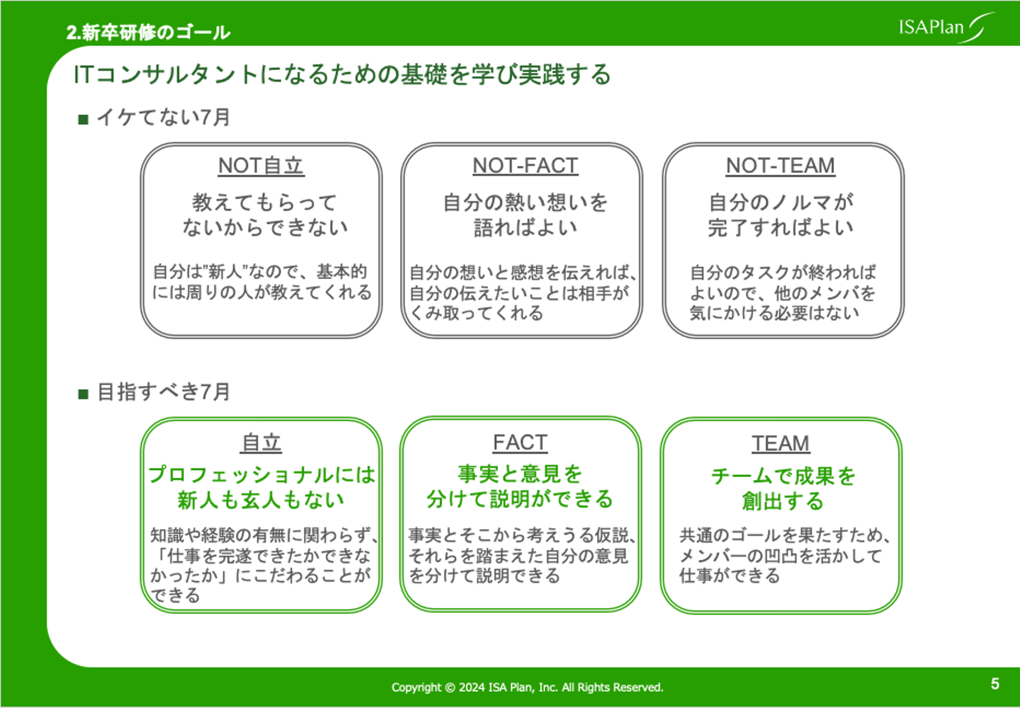毎年進化するアイエスエイプランの新卒研修ですが、今年の新卒研修は、①自立、②FACT、③TEAMというゴールを掲げてスタートしました。