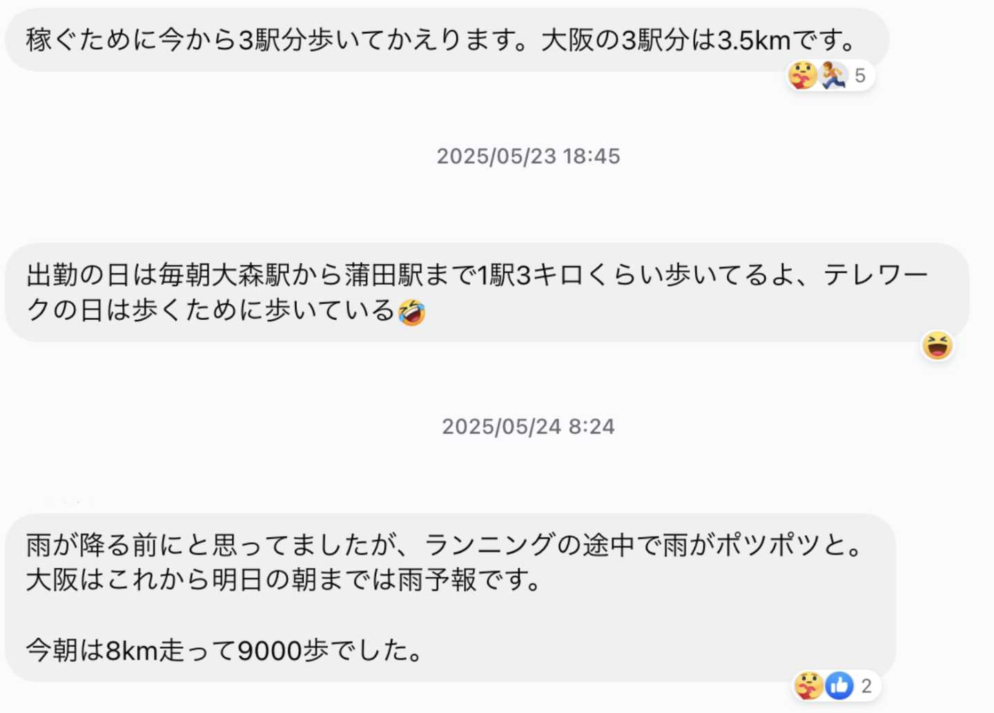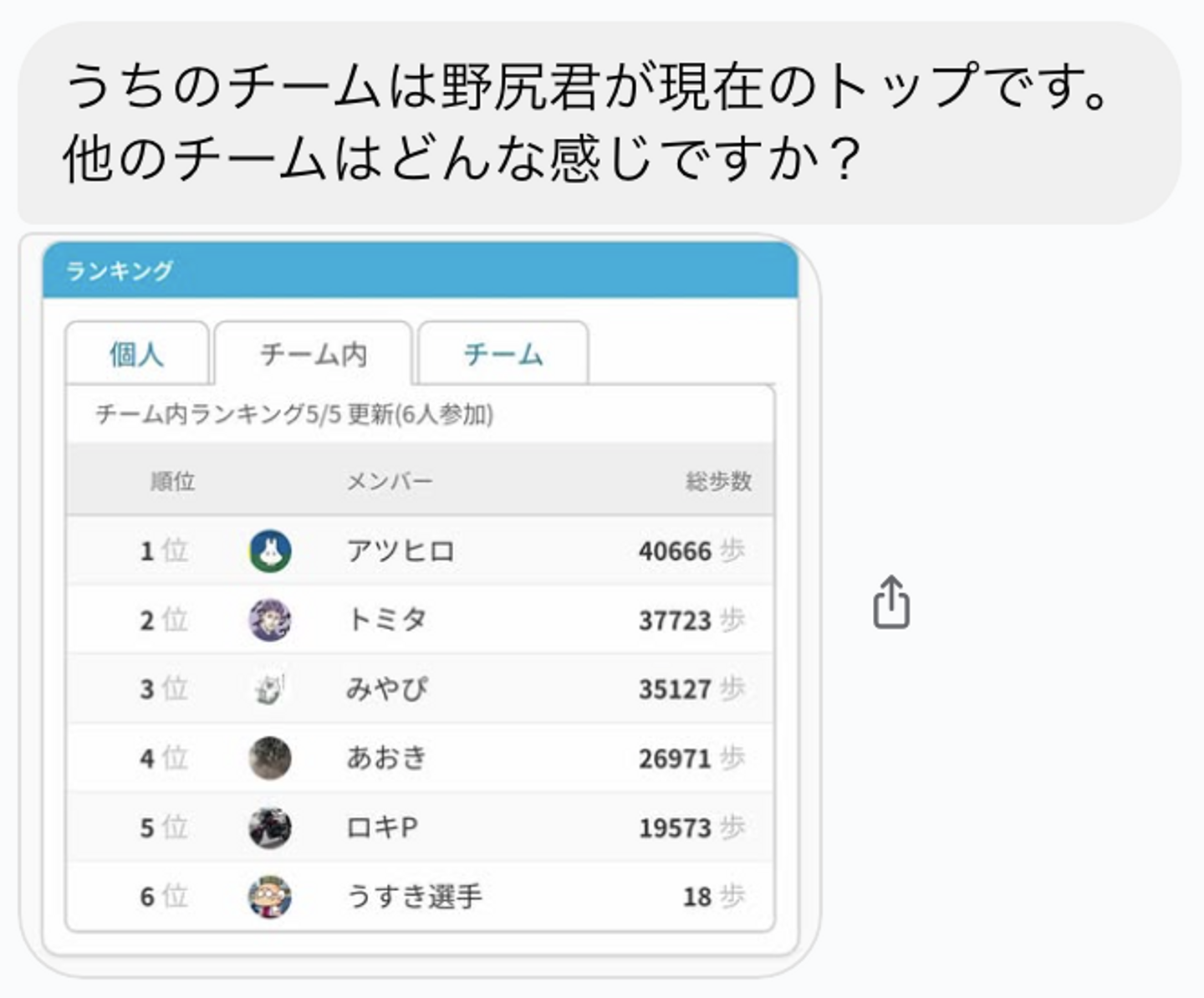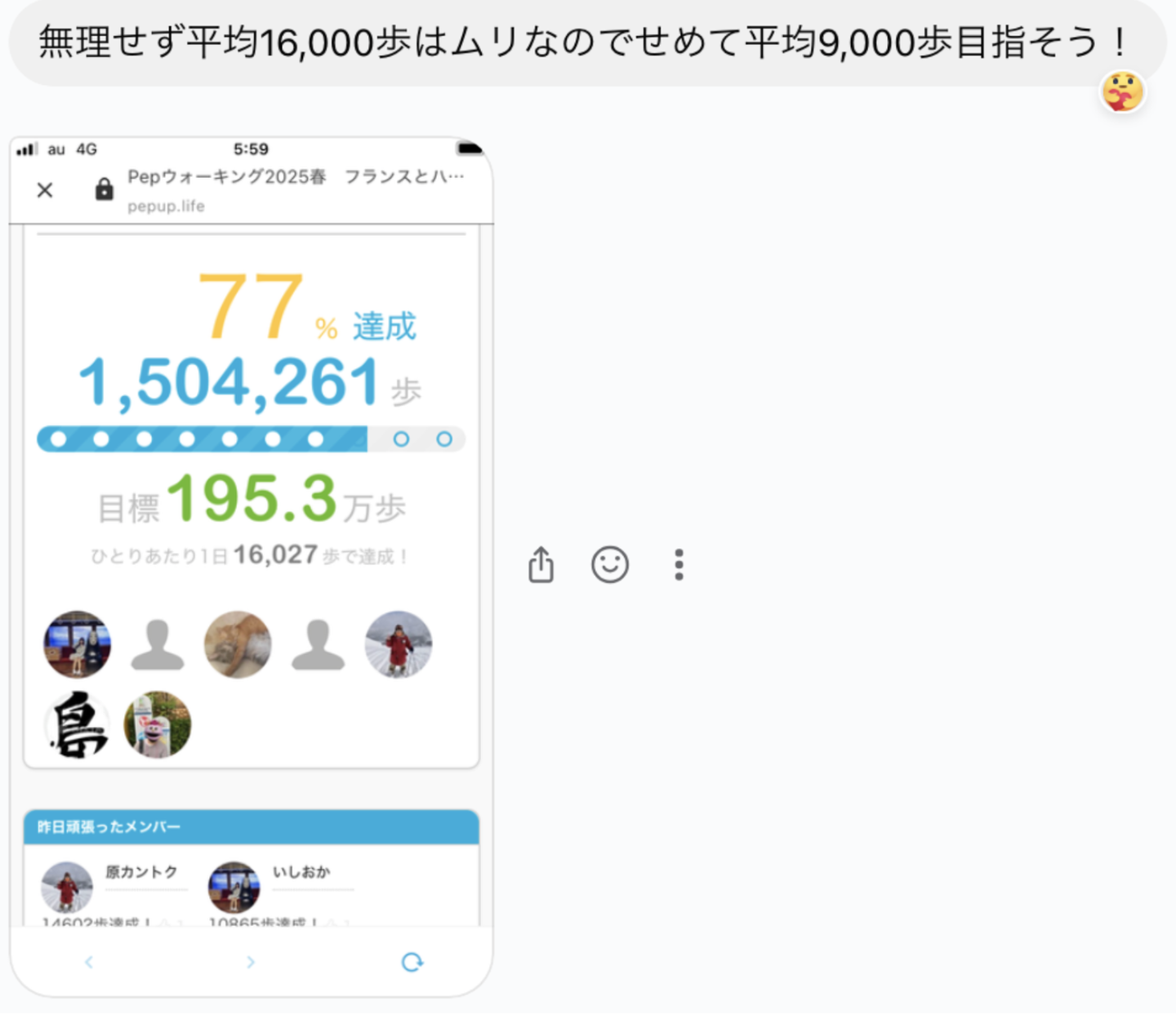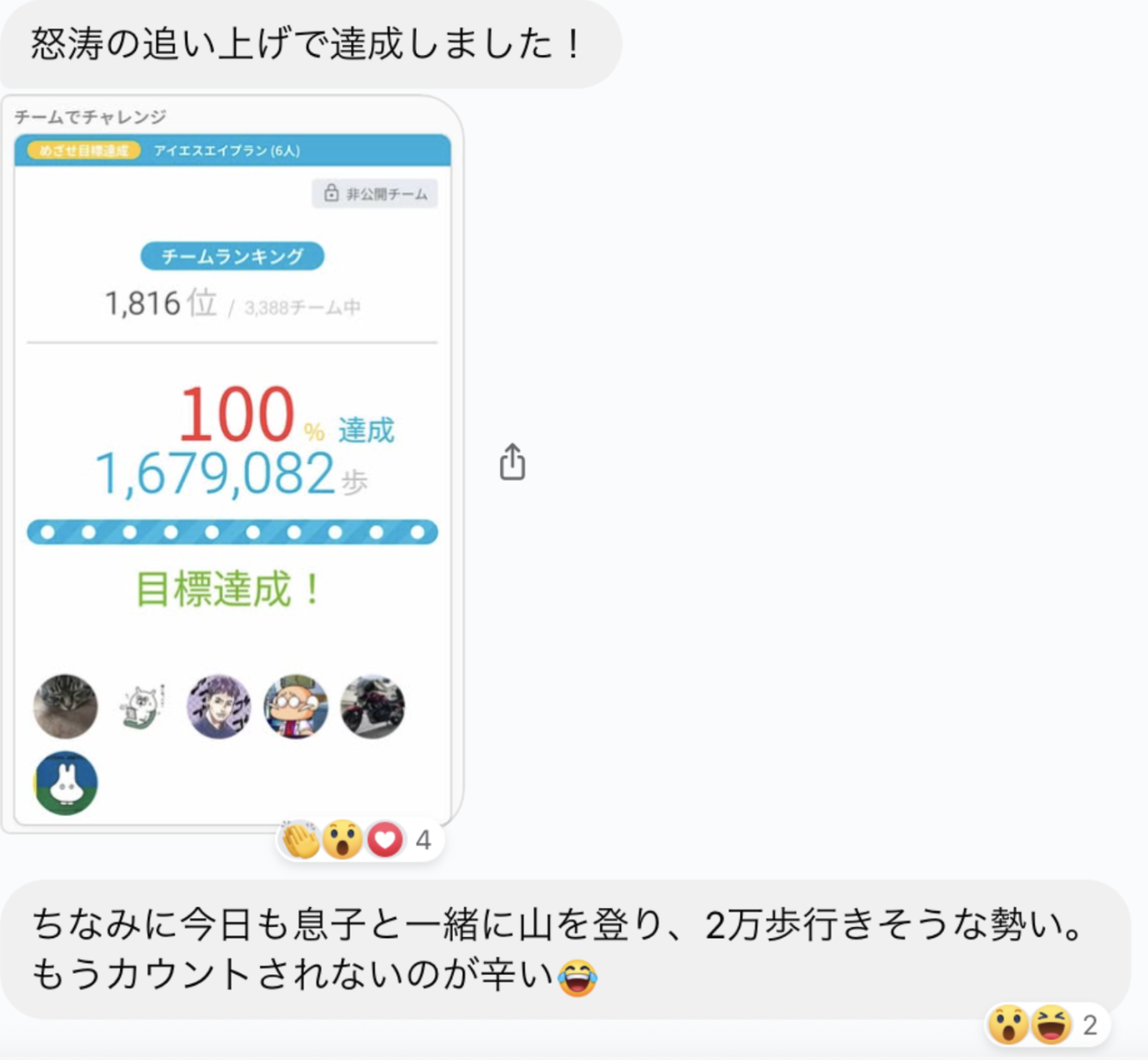 ウォーキングという共通の目標に向かって日々の歩数を共有し合うことで、自然なコミュニケーションが生まれていました。イベント期間中には、以下のようなやりとりが見られました。
