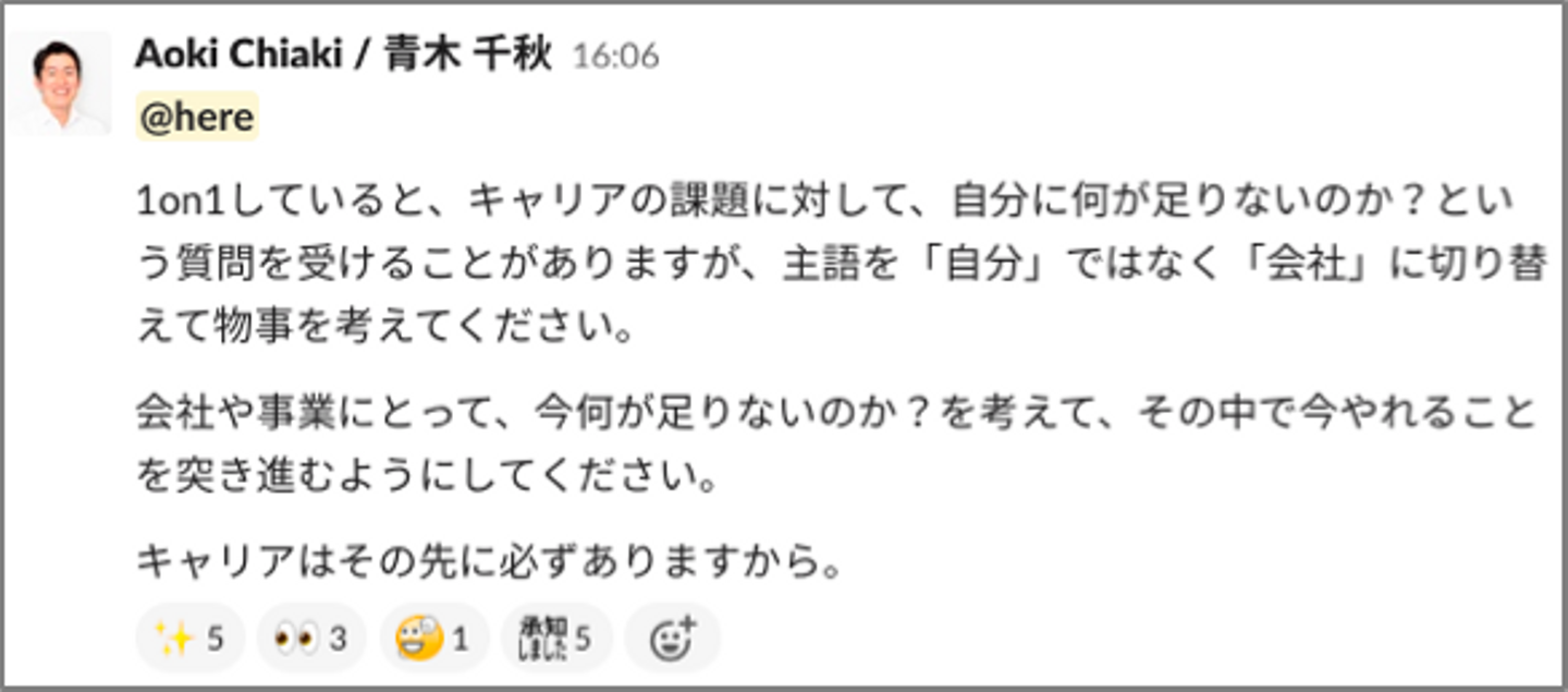 主語を「自分」から「会社」に切り替えて物事を考えるという視点は、私自身にいままでなかったものでした。
