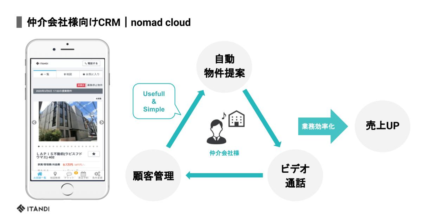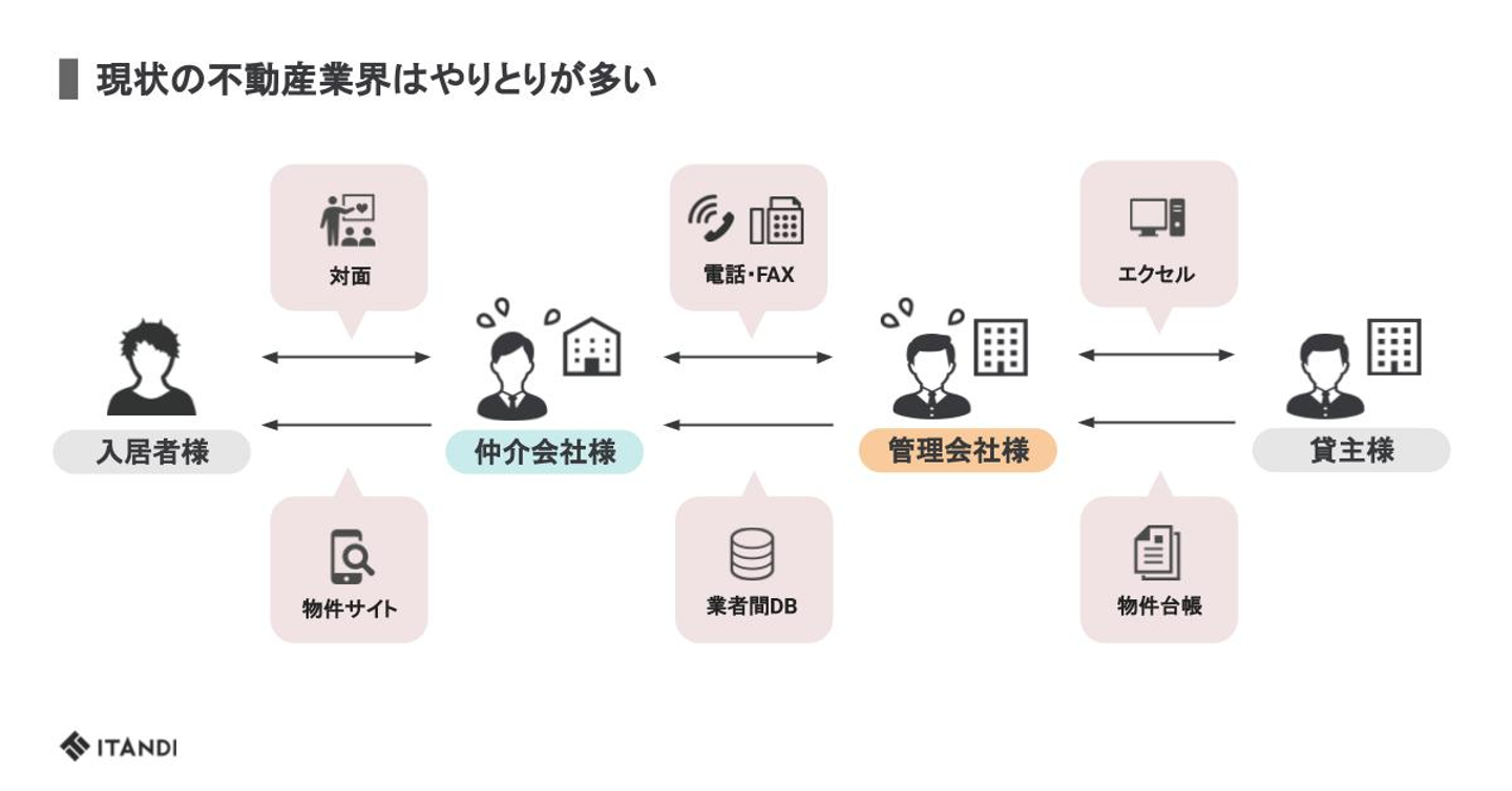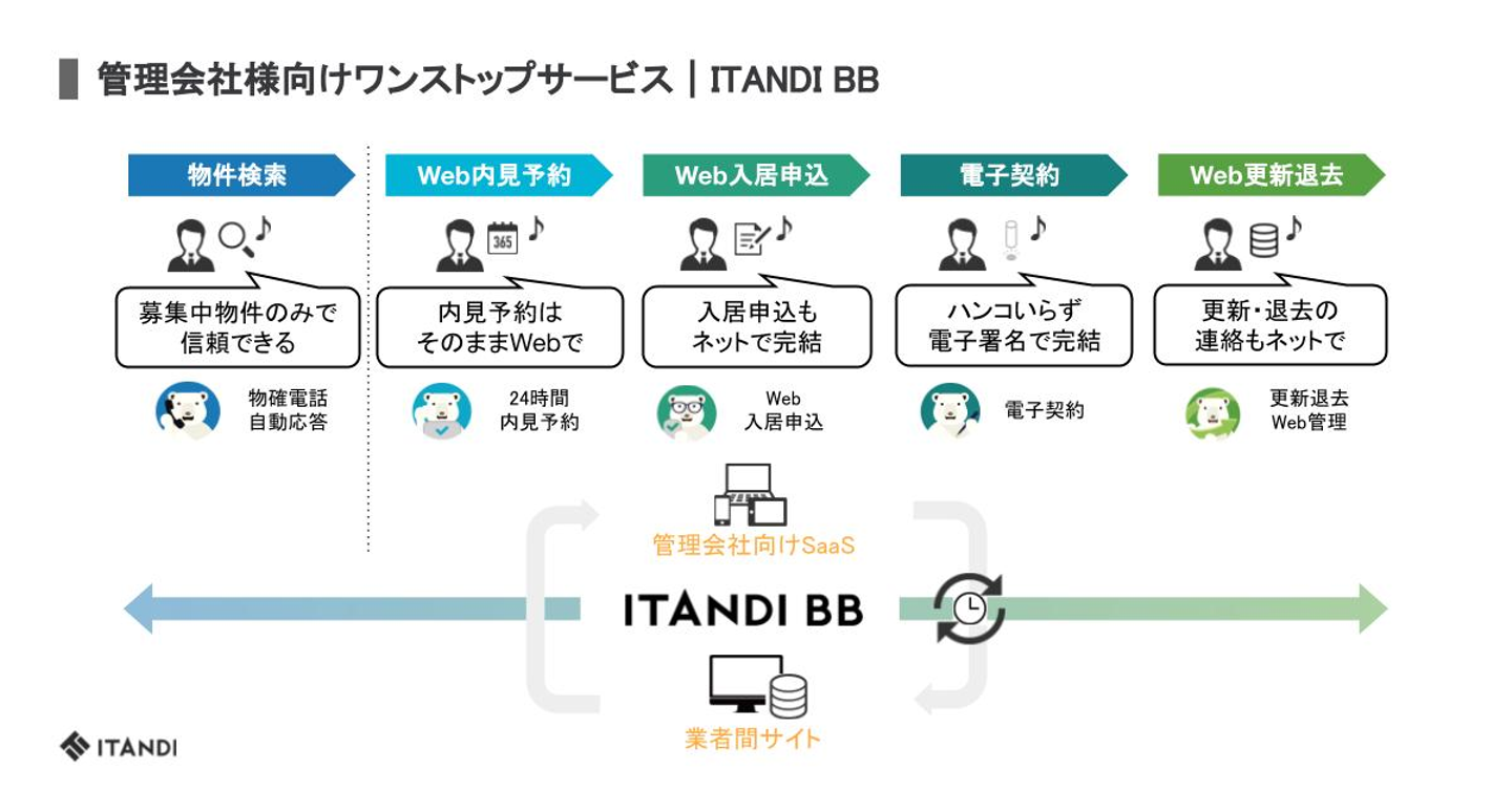 イタンジのサービスは、主に管理会社様が直面する不便に対し物件管理システム「ITANDI BB(内見予約くんや申込受付くんなど)」、また仲介会社様が直面する不便に対し追客サービス「nomad cloud」で業務効率化を支援します。