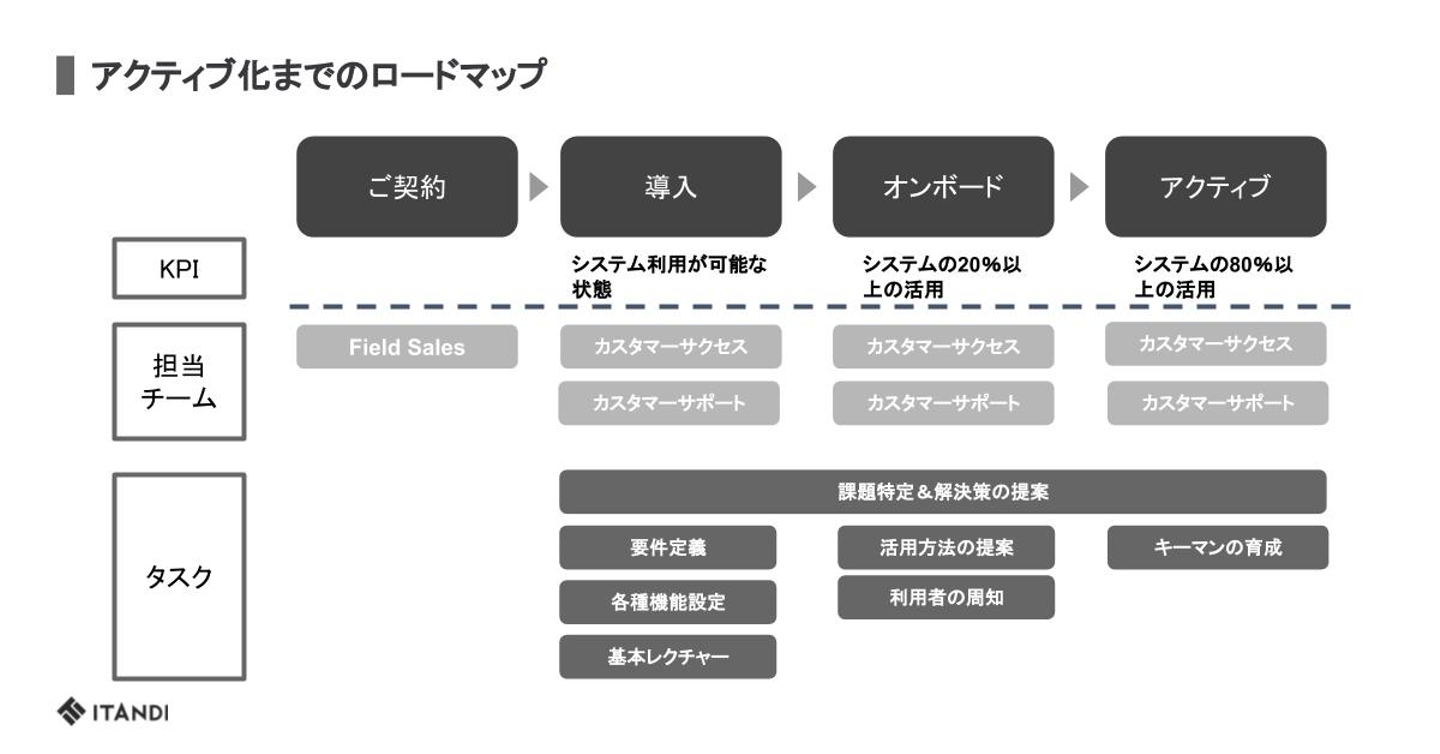 具体的に追っているKPIは、大きく「オンボーディング」(MRR:月ごとに繰り返し得られる収益)と「アクティブ化」(システム稼働率)に分けられますが、特に力を入れているのはアクティブ化です。活用していただけないことには、クライアントの課題解決につながりませんし、もちろんその先にいるユーザーの方々の「シームレスなお部屋探し」という体験にもつながりません。アクティブ化までのロードマップとして以下のものを描いています。