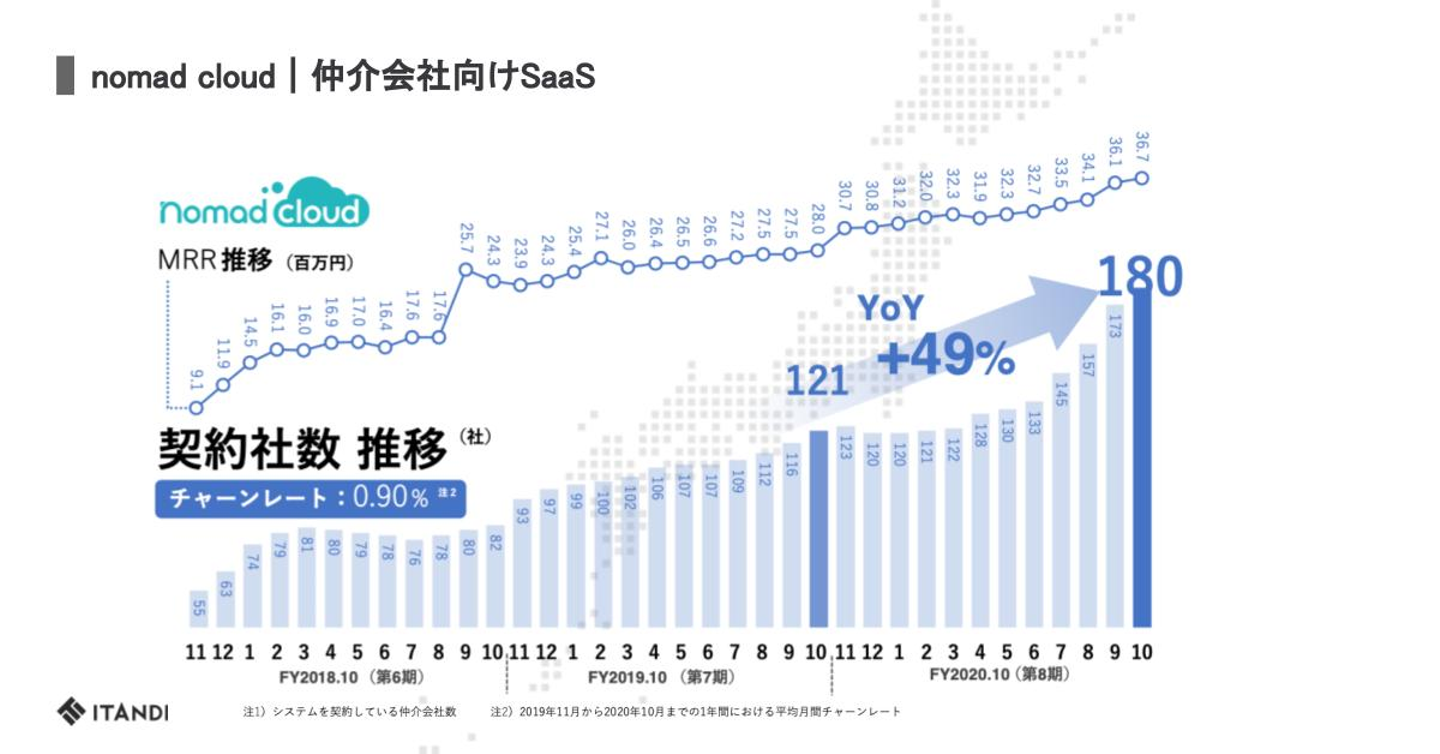 2020年度のコロナショックによりデジタル化を余儀なくされただけでなく、政権交代を期に政府主導のデジタル推進がなされるようになり、不動産業界でもDX化の大きな流れが起きつつあります。イタンジの「ITANDI BB」や「nomad cloud」も契約数を大きく伸ばし、それぞれ昨年比で+116%、+49%の成長を実現しています。