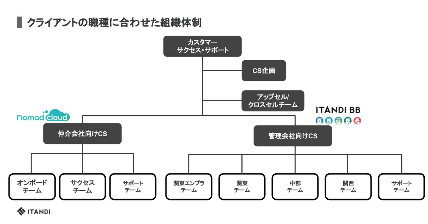 特徴的なのは管理会社様向けの「ITANDI BB」を担当するチームは、エリア別に編成されている点です。セールスも同様にエリア別編成となっており、セールスとCS(カスタマーサクセス)が密に連携してエリアの特性に合わせたサポートを展開しています。