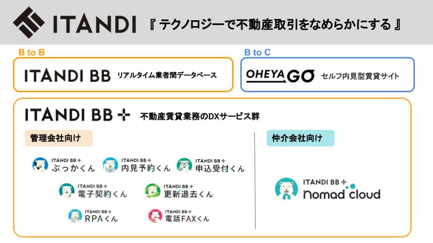 ・リアルタイム不動産業者間サイト「ITANDI BB(イタンジ ビービー)」 ・不動産賃貸業務のDXサービス群「ITANDI BB +(イタンジ ビービー プラス)」