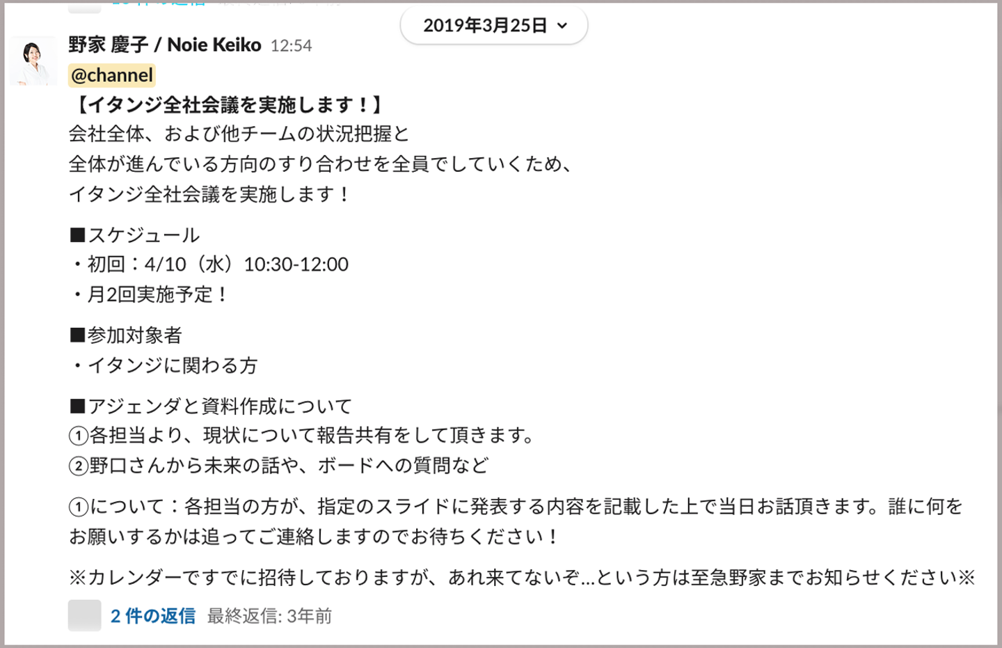 他にも、現在進行中の新規事業について担当メンバーがプレゼンしたり、代表の野口を始めボードメンバーたちが伝えたいことをメッセージングしたりなど、その時々でよりイタンジの事業進捗や方針を隠すことなく全メンバーに理解してもらうことを目的としています。