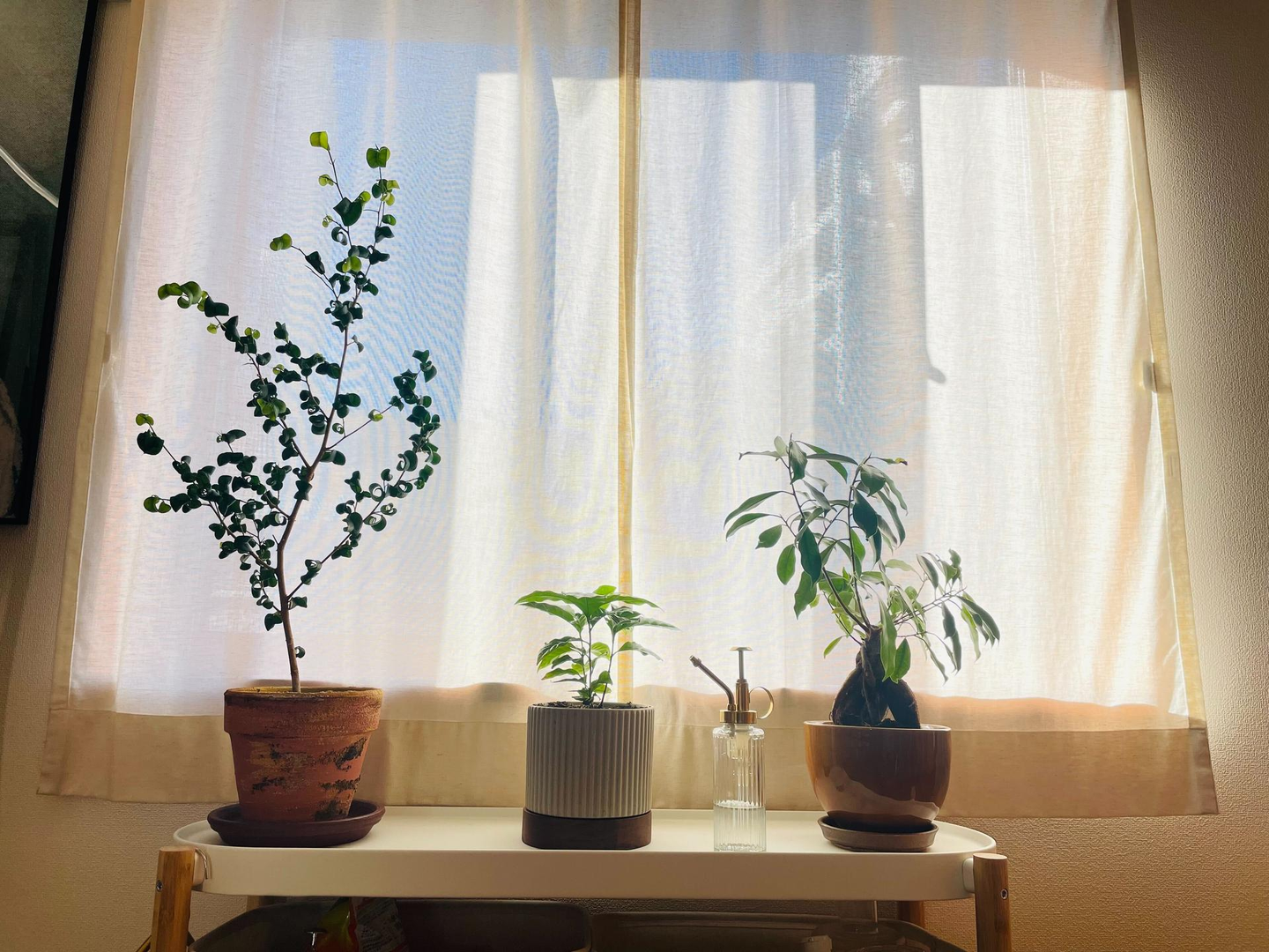 朝食はパンとコーヒーです。朝のうちにさっと掃除をして、植物に水をやります。