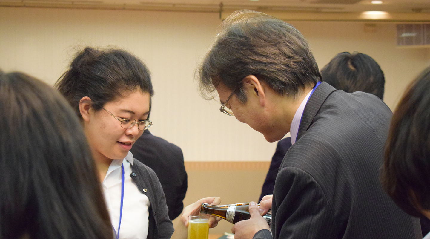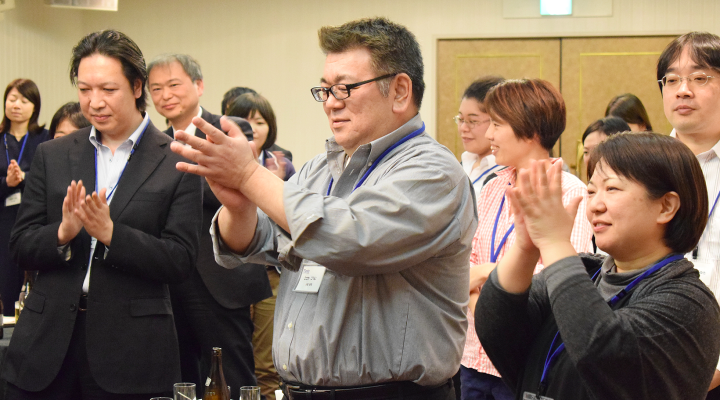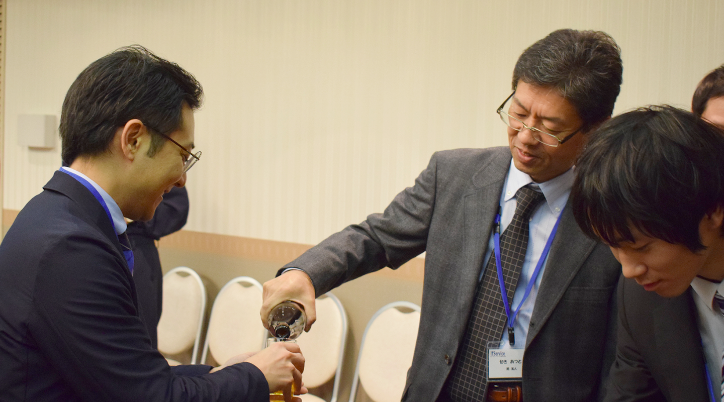 しばし食事&歓談タイム。皆さん、思い思いに食事を取ったり、気の会う仲間と会話したり。経営者も中堅も新人も、垣根なくフランクにコミュニケーションを取れるのが、ITSの良いところ。関社長や若木副社長も、自らさまざまなメンバーにビールを注いで回っていました。