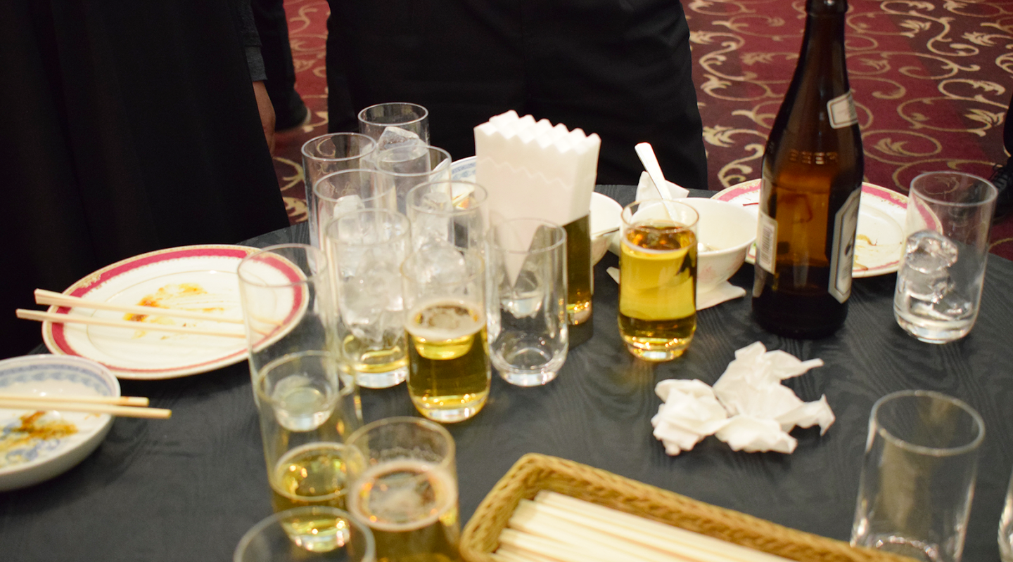 忘年会がスタートして30分。すでに料理はほとんど食べ尽くされていました…。皆さんお腹が空いていたんですね。料理だけでなく、お酒もだいぶ進んできた様子。そんな中、1つだけやたらと空きグラスの多いテーブルを発見しました!なんと、これでもホテルスタッフに片付けられた直後だったとか!(笑)