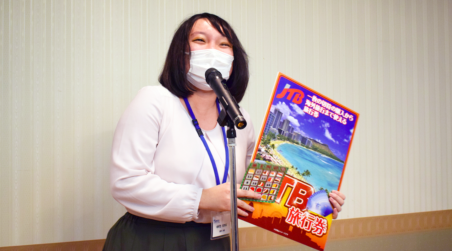 なんと、最後まで残ったのは一番の目玉景品であるJTB旅行券!最終的に、5人目の当選者として旅行券をゲットしたのは、ヘルプデスクの鈴木さんでした。鈴木さんは「あまり旅行に行くタイプではないので、どうしたら良いでしょうか…」と少し戸惑っている様子でしたが、司会の海輪さんの「旅行だけではなく、テーマパークでも使えますよ」という言葉を聞いた瞬間、「それなら嬉しいです!」と明るい表情に変わったのが印象的でした(笑) こうして白熱したビンゴ大会は閉幕!ちなみに、最初に当選した遠藤さんは、無事にひとめぼれを獲得しました。