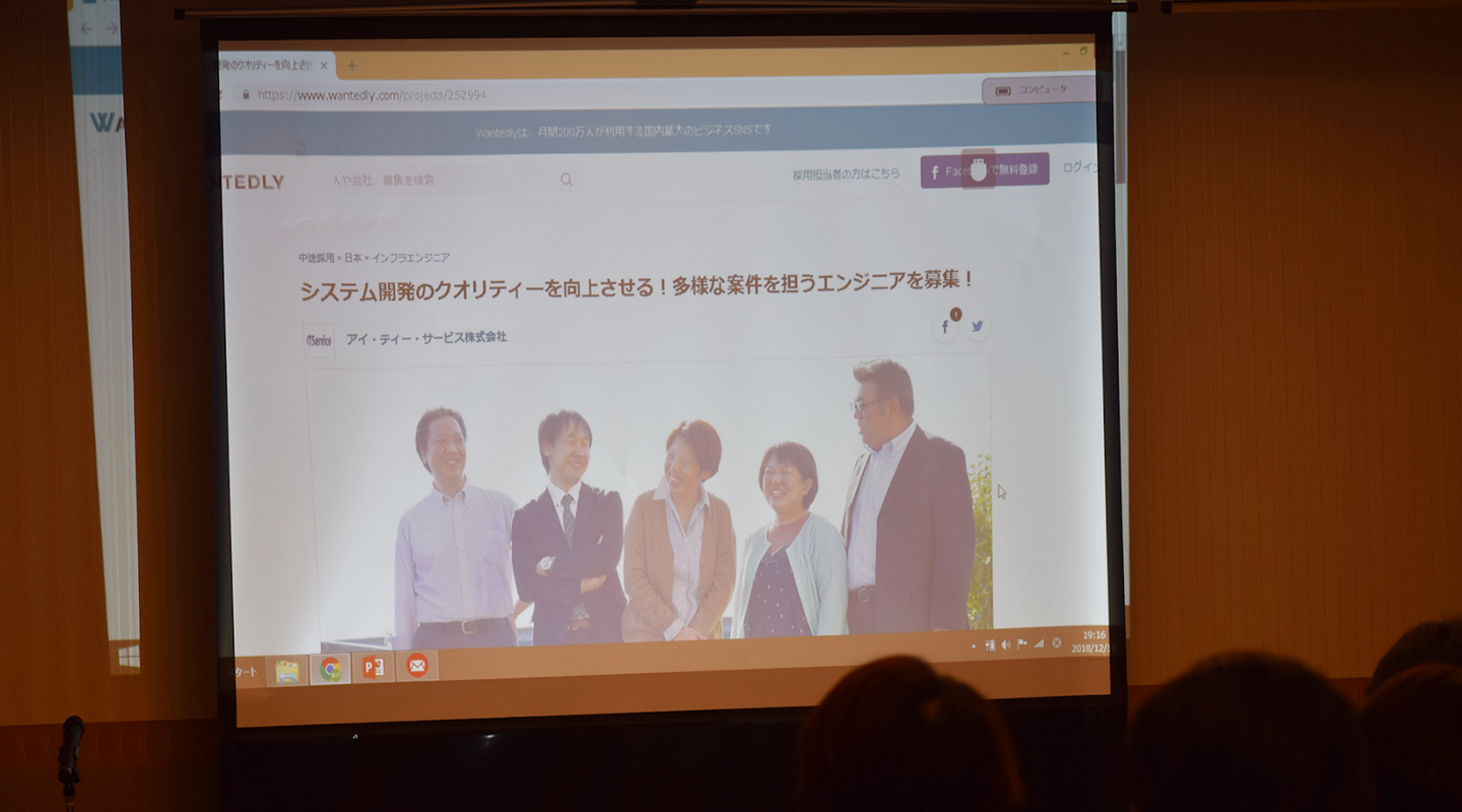 皆さん、社長の話を真剣に聞いていましたが、今期から力を入れている「採用サイトの立ち上げ」の一環としてWantedlyのページを紹介したところで、なぜか笑い(失笑?)が漏れました。どうやら、写真が「らしくない」「なんか恥ずかしい〜」とのこと!(笑)