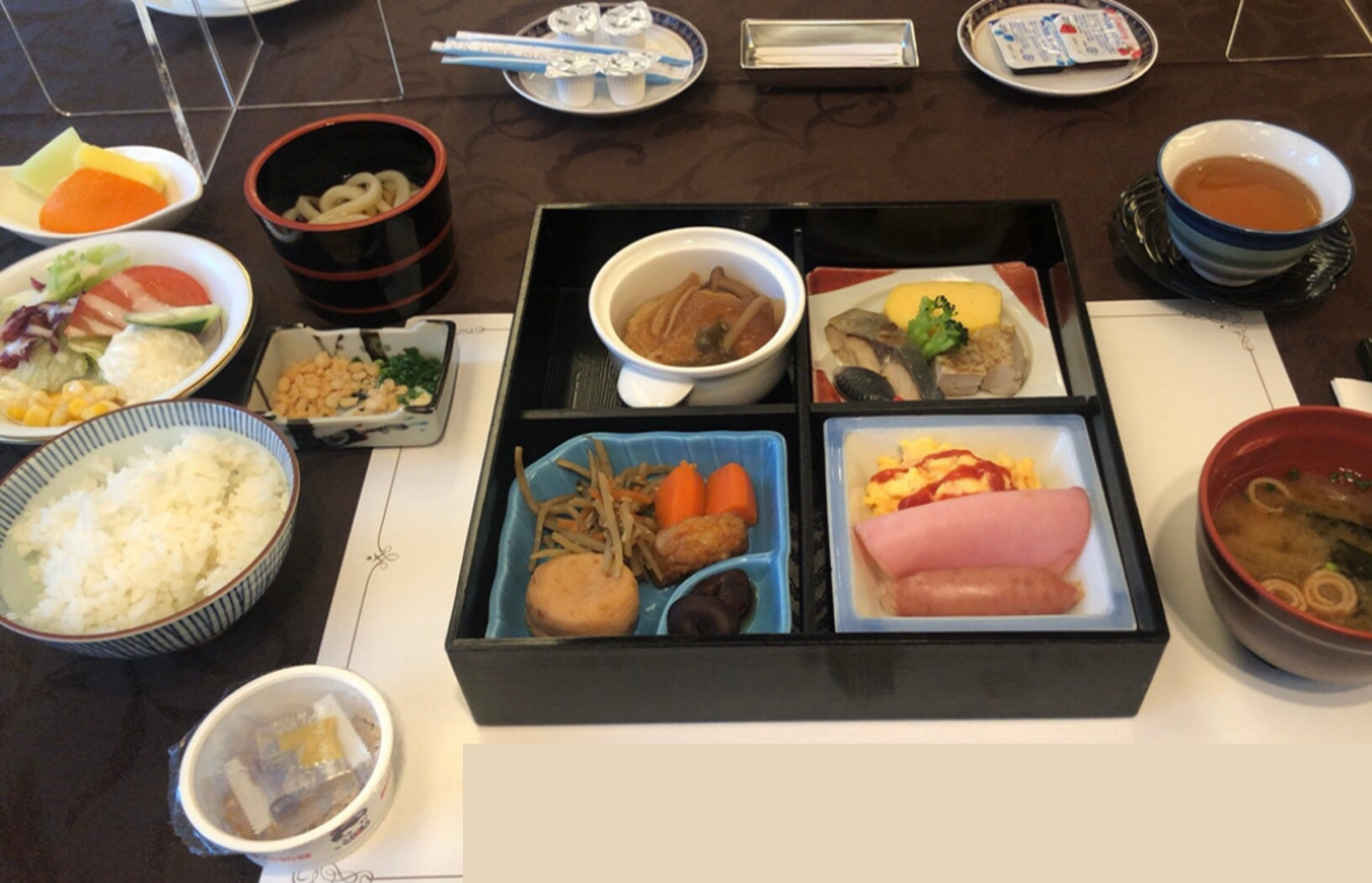 朝食にはなんと、お米の隣にうどんが!