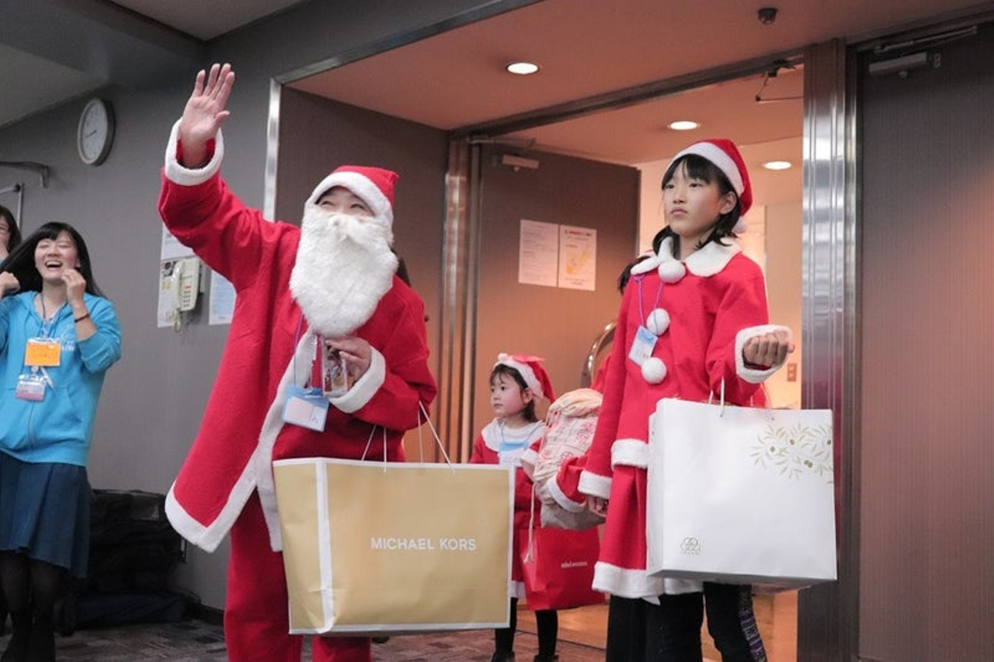 お!早速、窪田社長のご親族登場です。毎年、一家総出で参加くださるのですが、今年はみんなを楽しませるためにサンタの姿で来てくださいました。