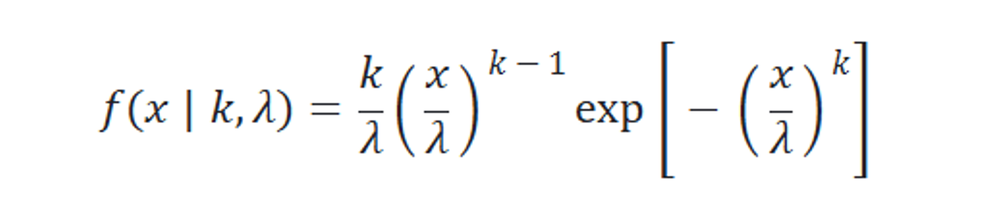 ここで k(>0)・λ(>0) はそれぞれ形状(shape)・尺度(scale)パラメータです。ワイブル分布は初期故障や経時的な摩耗による故障など製造業における代表的な不具合の発生パターンを表現できることから、ワイブル確率プロットなどで推定した shape や scale から故障モードを考察したり、また故障モードが変化するタイミングを評価することが可能[1]です。