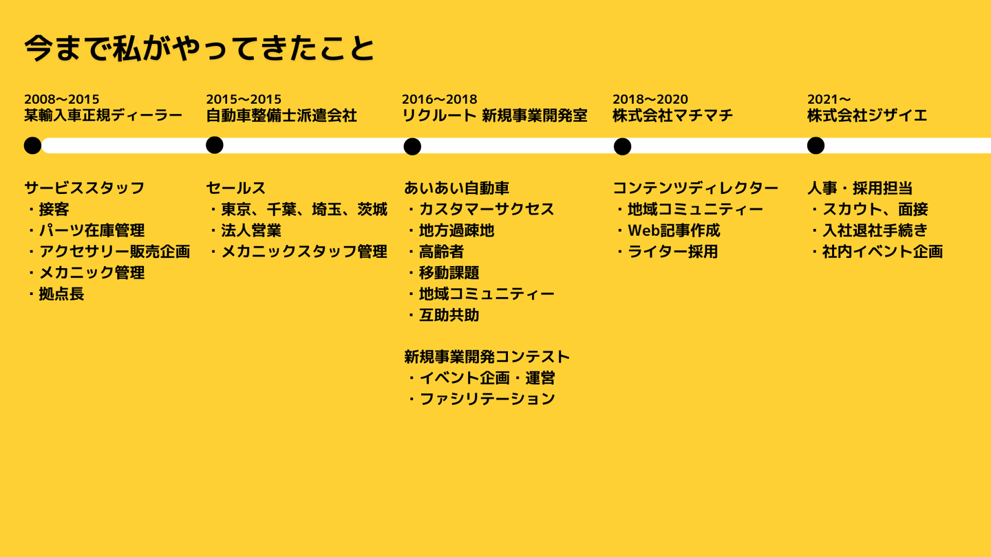 見ていただいてわかるように。ジザイエに至るまで、一貫して同じ職種をずっとやっていたキャリアではなく、今までさまざまな経験をさせていただきました。
