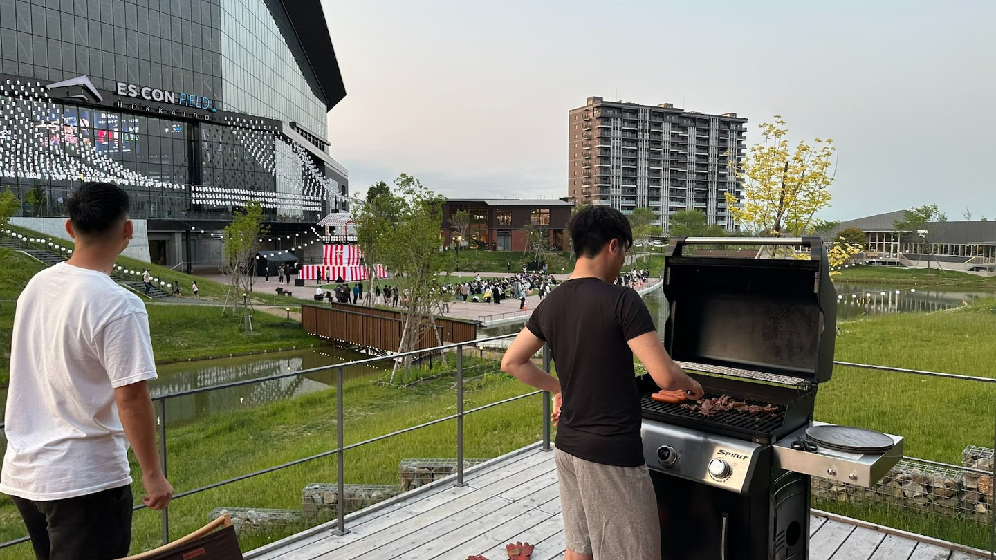 だんだんとライトアップしていくエスコンフィールドを横目に飲むお酒とBBQは最高でした!