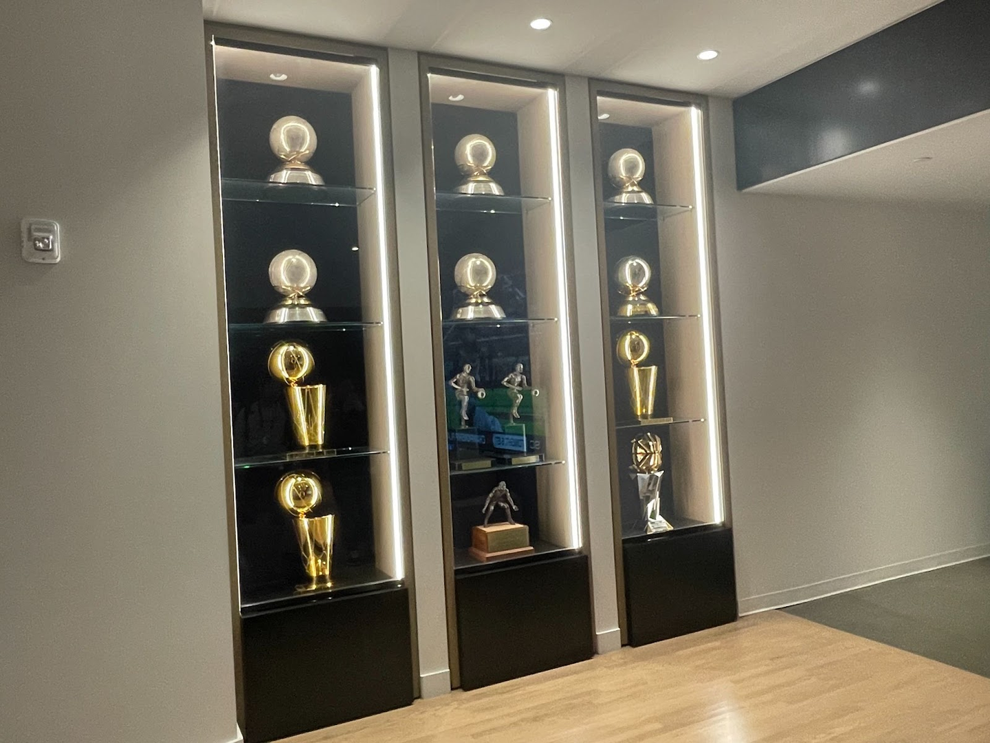 さて次は今回のSBCの(新堀的)メインディッシュであるChase Centerの視察をさせていただきました。関係者口で荷物検査などを行い、中に入るとなんとまず現れたのは受賞したトロフィーの数々…この時点で私の興奮はMAXでした(笑)