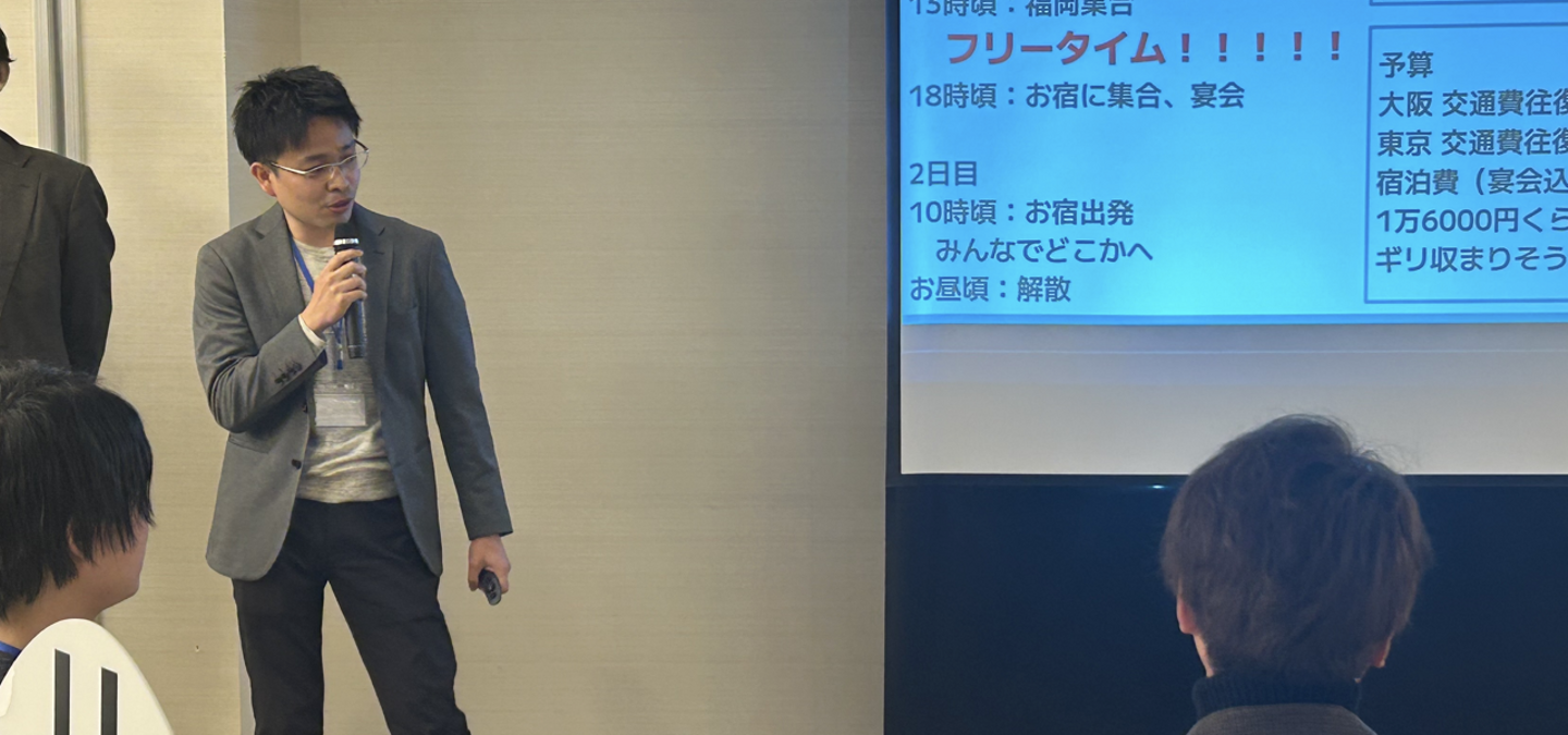 前月から、旅先候補地ごとのグループに分かれ良さをアピールするワークを行っており、その決勝戦として福岡vs富山のプレゼン大会も実施しました。(写真は福岡のプレゼン中)