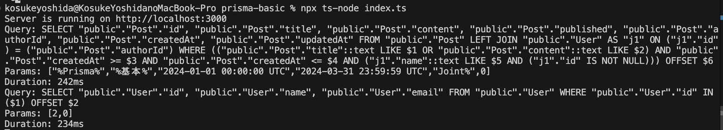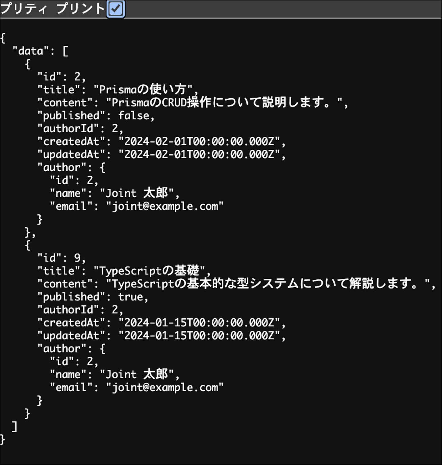http://localhost:3000/search?title=Prisma&content=%E5%9F%BA%E6%9C%AC&published=true&startDate=2024-01-01T00:00:00Z&endDate=2024-03-31T23:59:59Z&authorName=Joint次のようなデータが取得できるはずです。