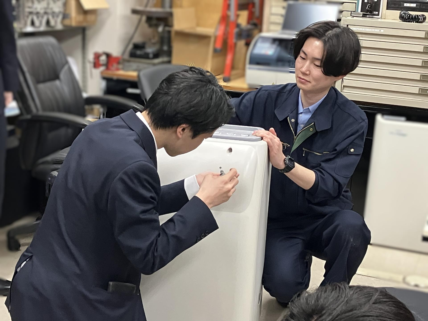 サービス職の仕事体験では、X線写真をデジタル画像化できる装置の内部構造を確認するなど、常光の強みである放射線関連機器に焦点を当てました。実際の動作原理や仕組みについての説明に、真剣に耳を傾けていたようです。